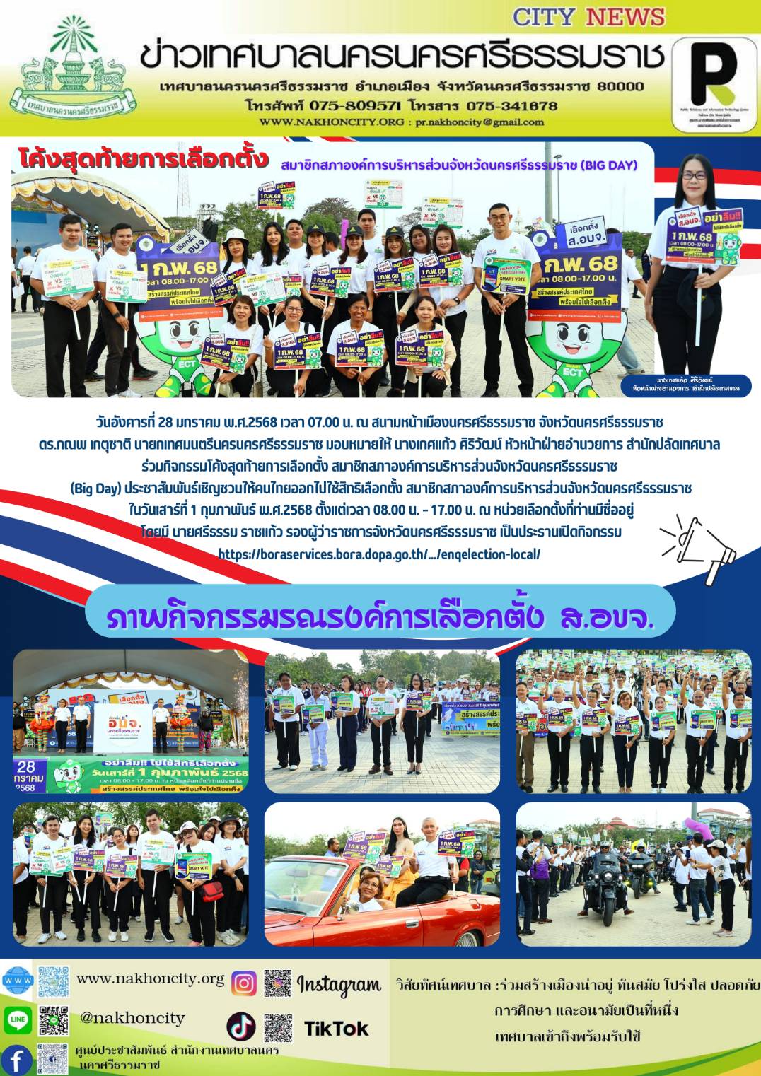 | วันอังคารที่ 28 มกราคม พ.ศ.2568 เวลา 07.00 น. ณ สนามหน้าเมืองนครศรีธรรมราช จังหวัดนครศรีธรรมราช ดร.กณพ เกตุชาติ นายกเทศมนตรีนครนครศรีธรรมราช มอบหมายให้ นางเกศแก้ว ศิริวัฒน์ หัวหน้าฝ่ายอำนวยการ สำนักปลัดเทศบาล ร่วมกิจกรรมโค้งสุดท้ายการเลือกตั้ง สมาชิกสภาองค์การบริหารส่วนจังหวัดนครศรีธรรมราช (Big Day) ประชาสัมพันธ์เชิญชวนให้คนไทยออกไปใช้สิทธิเลือกตั้ง สมาชิกสภาองค์การบริหารส่วนจังหวัดนครศรีธรรมราช ในวันเสาร์ที่ 1 กุมภาพันธ์ พ.ศ.2568 ตั้งแต่เวลา 08.00 น. – 17.00 น. ณ หน่วยเลือกตั้งที่ท่านมีชื่ออยู่ https://boraservices.bora.dopa.go.th/.../enqelection-local/ โดยมี นายศรีธรรม ราชแก้ว รองผู้ว่าราชการจังหวัดนครศรีธรรมราช เป็นประธานเปิดกิจกรรม ............. ภาพ//ข่าว//จันทร์จิรา |