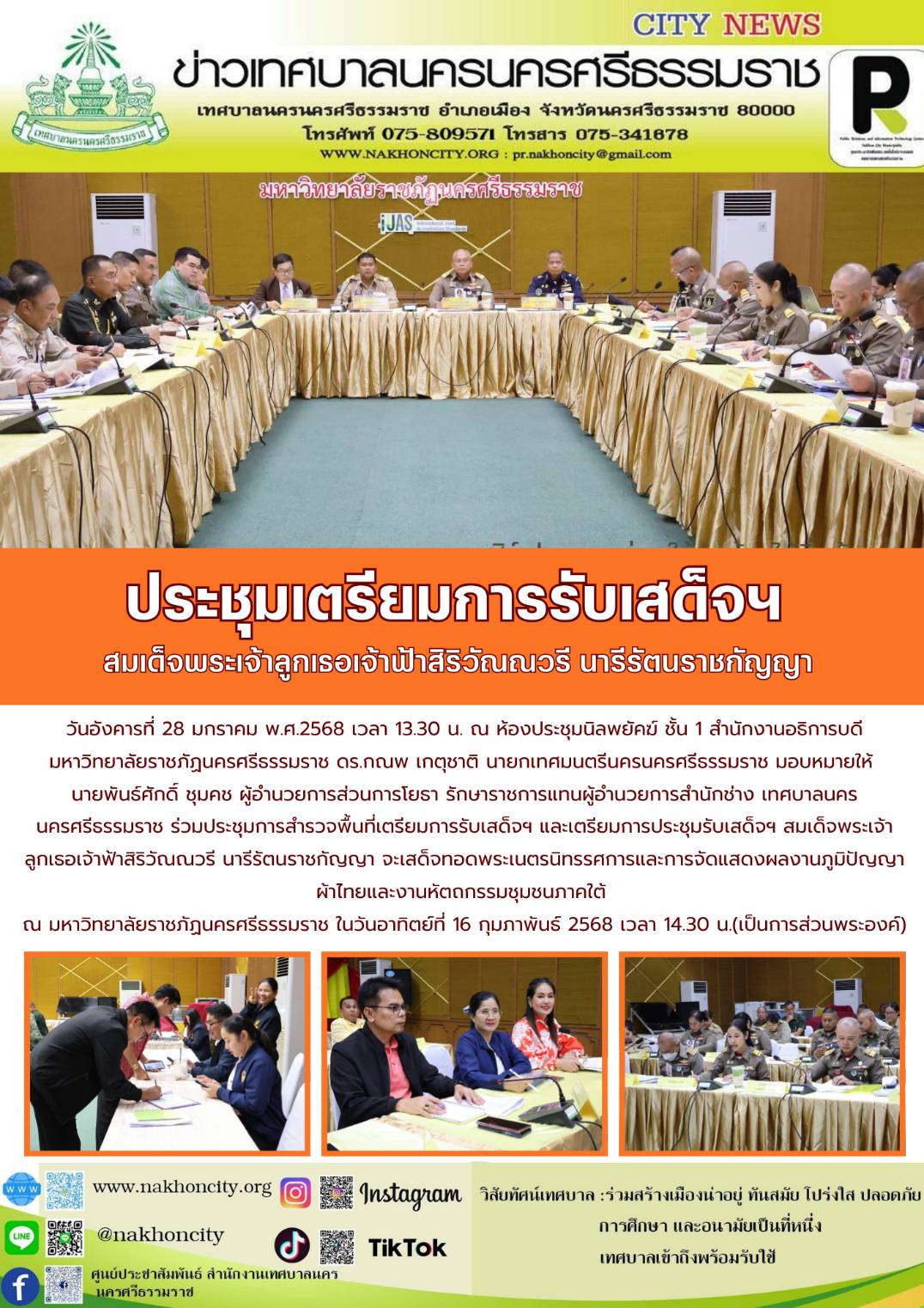 | วันอังคารที่ 28 มกราคม พ.ศ.2568 เวลา 13.30 น. ณ ห้องประชุมนิลพยัคฆ์ ชั้น 1 สำนักงานอธิการบดี มหาวิทยาลัยราชภัฏนครศรีธรรมราช ดร.กณพ เกตุชาติ นายกเทศมนตรีนครนครศรีธรรมราช มอบหมายให้ นายพันธ์ศักดิ์ ชุมคช ผู้อำนวยการส่วนการโยธา รักษาราชการแทนผู้อำนวยการสำนักช่าง เทศบาลนครนครศรีธรรมราช ร่วมประชุมการสำรวจพื้นที่เตรียมการรับเสด็จฯ และเตรียมการประชุมรับเสด็จฯ สมเด็จพระเจ้าลูกเธอเจ้าฟ้าสิริวัณณวรี นารีรัตนราชกัญญา จะเสด็จทอดพระเนตรนิทรรศการและการจัดแสดงผลงานภูมิปัญญาผ้าไทยและงานหัตถกรรมชุมชนภาคใต้ ณ มหาวิทยาลัยราชภัฏนครศรีธรรมราช ในวันอาทิตย์ที่ 16 กุมภาพันธ์ 2568 เวลา 14.30 น.(เป็นการส่วนพระองค์) ............... ข่าว//จันทร์จิรา ภาพ//จันทร์จิรา//เจนจิรา//ปัญชนา (นักศึกษาฝึกงาน) |