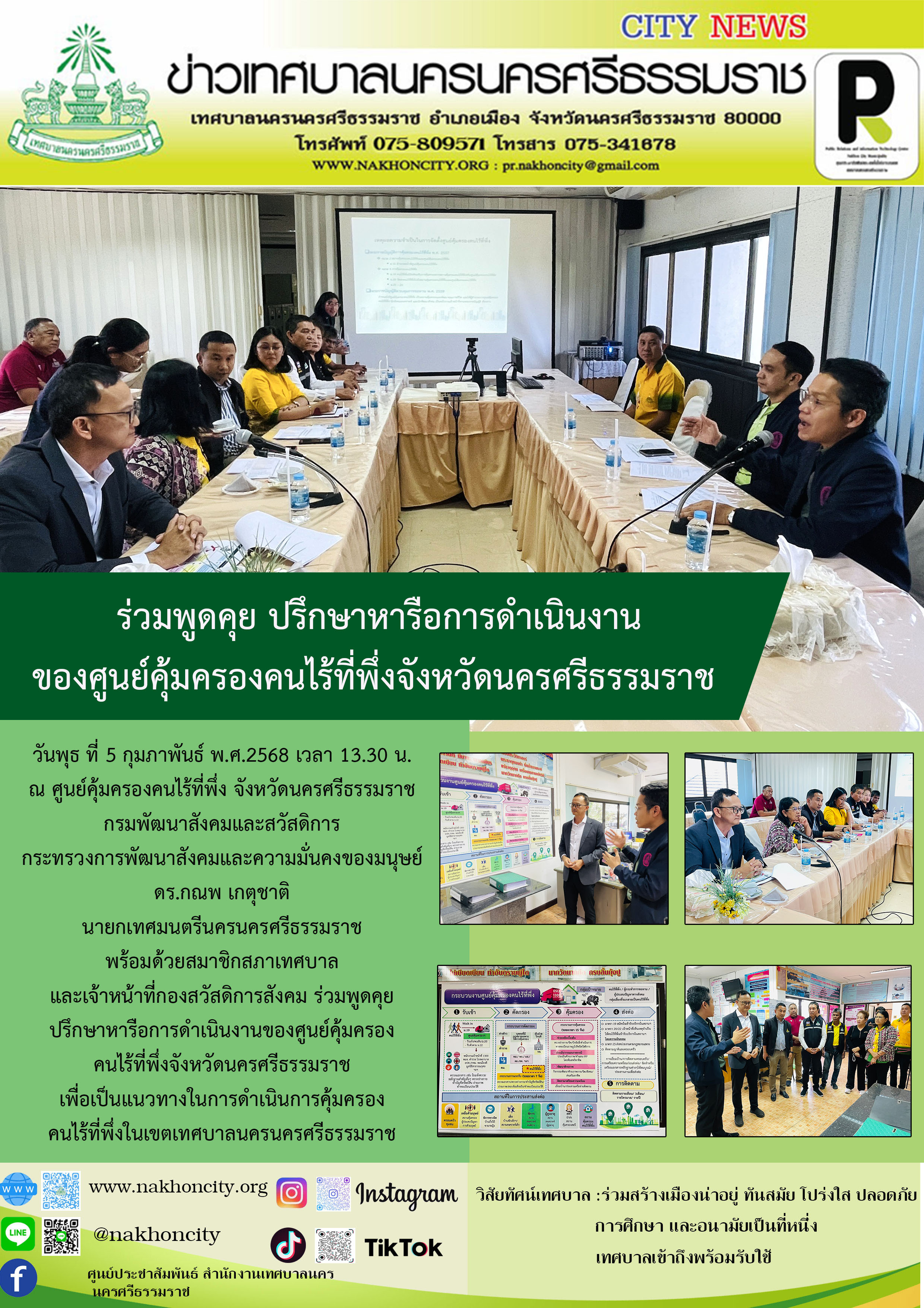 | นายกเทศมนตรีนครนครศรีธรรมราช พร้อมด้วยสมาชิกสภาเทศบาล และเจ้าหน้าที่กองสวัสดิการสังคม ร่วมพูดคุยปรึกษาหารือการดำเนินงานของศูนย์คุ้มครองคนไร้ที่พึ่งจังหวัดนครศรีธรรมราช |