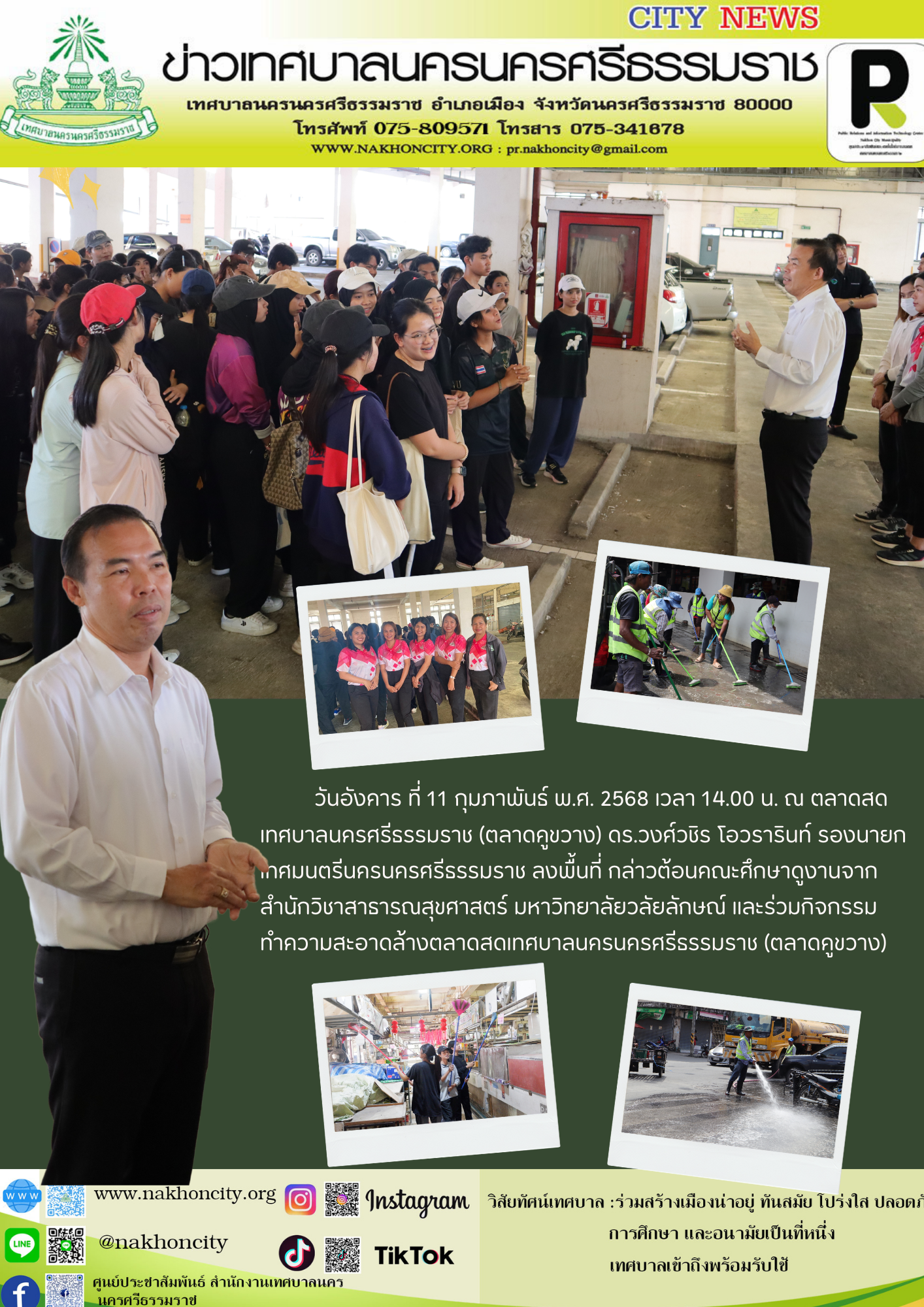 | วันอังคาร ที่ 11 กุมภาพันธ์ พ.ศ.2568 เวลา 14.00 น. ณ ตลาดสดเทศบาลนครศรีธรรมราช (ตลาดคูขวาง) ดร.วงศ์วชิร โอวรารินท์ รองนายกเทศมนตรีนครนครศรีธรรมราช ลงพื้นที่ กล่าวต้อนคณะศึกษาดูงานจาก สำนักวิชาสาธารณสุขศาสตร์ มหาวิทยาลัยวลัยลักษณ์ และร่วมกิจกรรม ทำความสะอาดล้างตลาดสดเทศบาลนครนครศรีธรรมราช (ตลาดคูขวาง) |