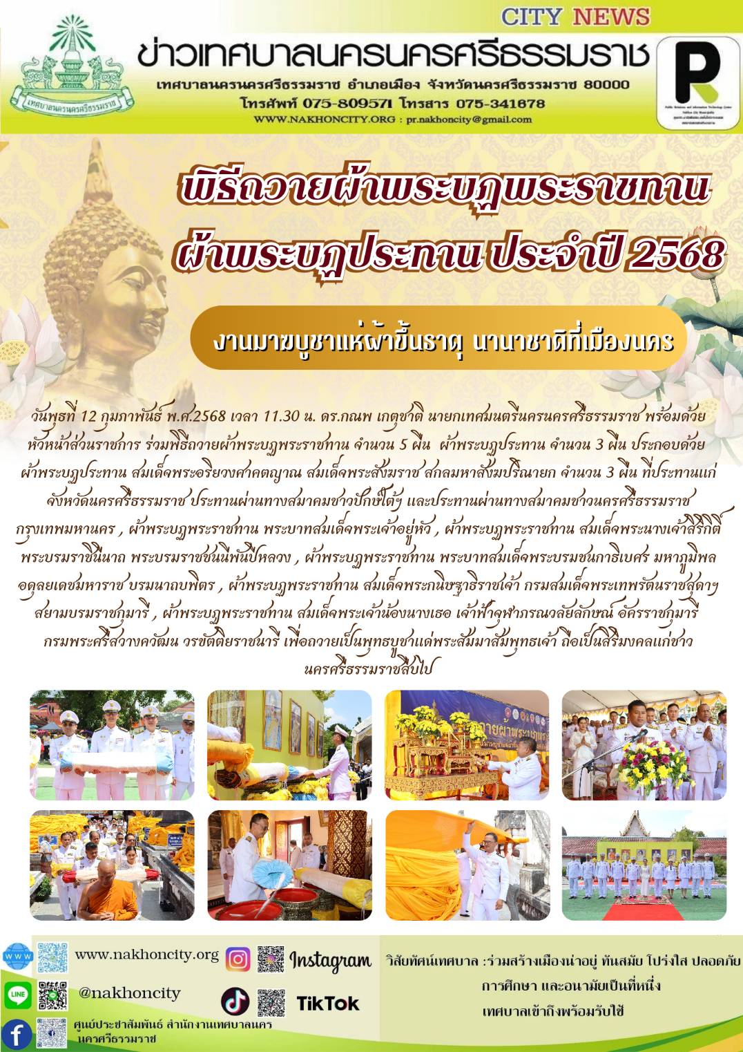 | ดร.กณพ เกตุชาติ นายกเทศมนตรีนครนครศรีธรรมราช ร่วมพิธีถวายผ้าพระบฏพระราชทาน ในงานมาฆบูชาแห่ผ้าขึ้นธาตุ ประจำปี 2568 |