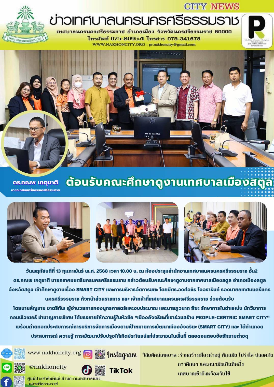 | วันพฤหัสบดีที่ 13 กุมภาพันธ์ พ.ศ. 2568 เวลา 10.00 น. ณ ห้องประชุมสำนักงานเทศบาลนครนครศรีธรรมราช ชั้น2 ดร.กณพ เกตุชาติ นายกเทศมนตรีนครนครศรีธรรมราช กล่าวต้อนรับคณะศึกษาดูงานจากเทศบาลเมืองสตูล อำเภอเมืองสตูล จังหวัดสตูล เข้าศึกษาดูงานเรื่อง Smart City และการบริหารจัดการขยะ โดยมีดร.วงศ์วชิร โอวรารินท์ รองนายกเทศมนตรีนครนครศรีธรรมราช หัวหน้าส่วนราชการ และ เจ้าหน้าที่เทศบาลนครนครศรีธรรมราช ร่วมต้อนรับ โดยนายสัญชาย ชาตรีทัพ ผู้อำนวยการกองยุทธศาสตร์และงบประมาณ และนายภูวนาถ ฑีฆะ รักษาการในตำแหน่ง นักวิชาการคอมพิวเตอร์ ชำนาญการพิเศษ ได้บรรยายให้ความรู้ในห้วข้อ "เมืองอัจฉริยะที่เราร่วมสร้าง People-Centric Smart City" พร้อมถ่ายทอดประสบการณ์การบริหารจัดการเมืองตามเป้าหมายการพัฒนาเมืองอัจฉริยะ (Smart City) และ ได้ถ่ายทอดประสบการณ์ ความรู้ การพัฒนาปรับปรุงให้เกิดประโยชน์แก่ประชาชนในพื้นที่ ตลอดจนตอบข้อซักถามต่างๆ ............. ภาพ//ข่าว//จันทร์จิรา ตรวจททาน//ฐิตินันท์ |