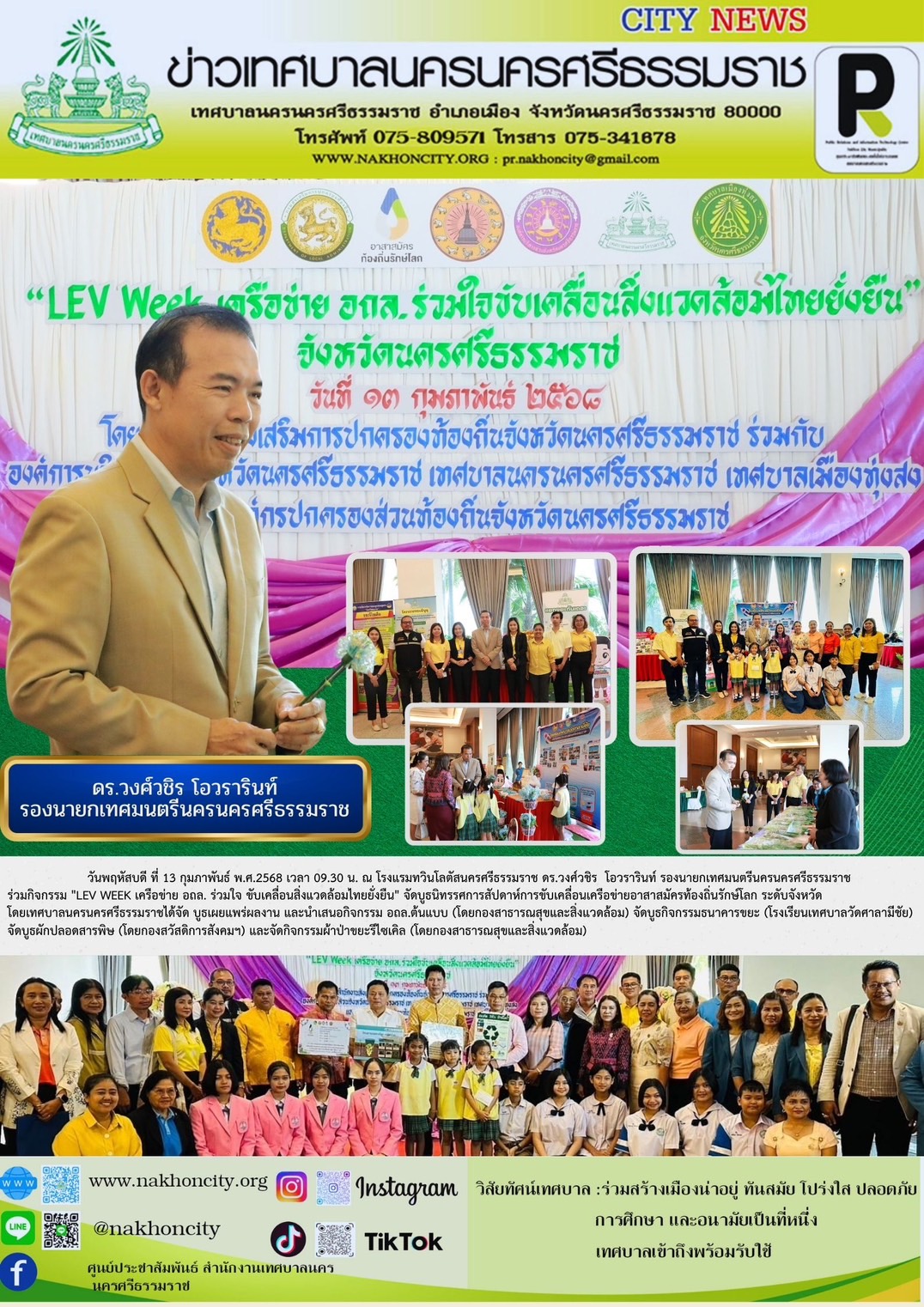 | รองนายกเทศมนตรีนครนครศรีธรรมราช ร่วมกิจกรรม "LEV Week เครือข่าย อถล. ร่วมใจ ขับเคลื่อนสิ่งแวดล้อมไทยยั่งยืน" จัดบูธนิทรรศการสัปดาห์การขับเคลื่อนเครือข่ายอาสาสมัครท้องถิ่นรักษ์โลก ระดับจังหวัด |