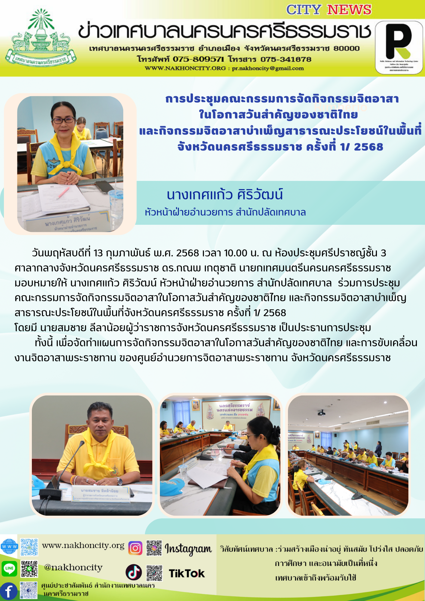 | วันพฤหัสบดีที่ 13 กุมภาพันธ์ พ.ศ. 2568 เวลา 10.00 น. ณ ห้องประชุมศรีปราชญ์ชั้น 3 ศาลากลางจังหวัดนครศรีธรรมราช ดร.กณพ เกตุชาติ นายกเทศมนตรีนครนครศรีธรรมราช มอบหมายให้ นางเกศแก้ว ศิริวัฒน์ หัวหน้าฝ่ายอำนวยการ สำนักปลัดเทศบาล ร่วมการประชุมคณะกรรมการจัดกิจกรรมจิตอาสาในโอกาสวันสำคัญของชาติไทย และกิจกรรมจิตอาสาบำเพ็ญสาธารณะประโยชน์ในพื้นที่จังหวัดนครศรีธรรมราช ครั้งที่ 1/ 2568 โดยมี นายสมชาย ลีลาน้อยผู้ว่าราชการจังหวัดนครศรีธรรมราช เป็นประธานการประชุม ทั้งนี้ เพื่อจัดทำแผนการจัดกิจกรรมจิตอาสาในโอกาสวันสำคัญของชาติไทย และการขับเคลื่อนงานจิตอาสาพระราชทาน ของศูนย์อำนวยการจิตอาสาพระราชทาน จังหวัดนครศรีธรรมราช