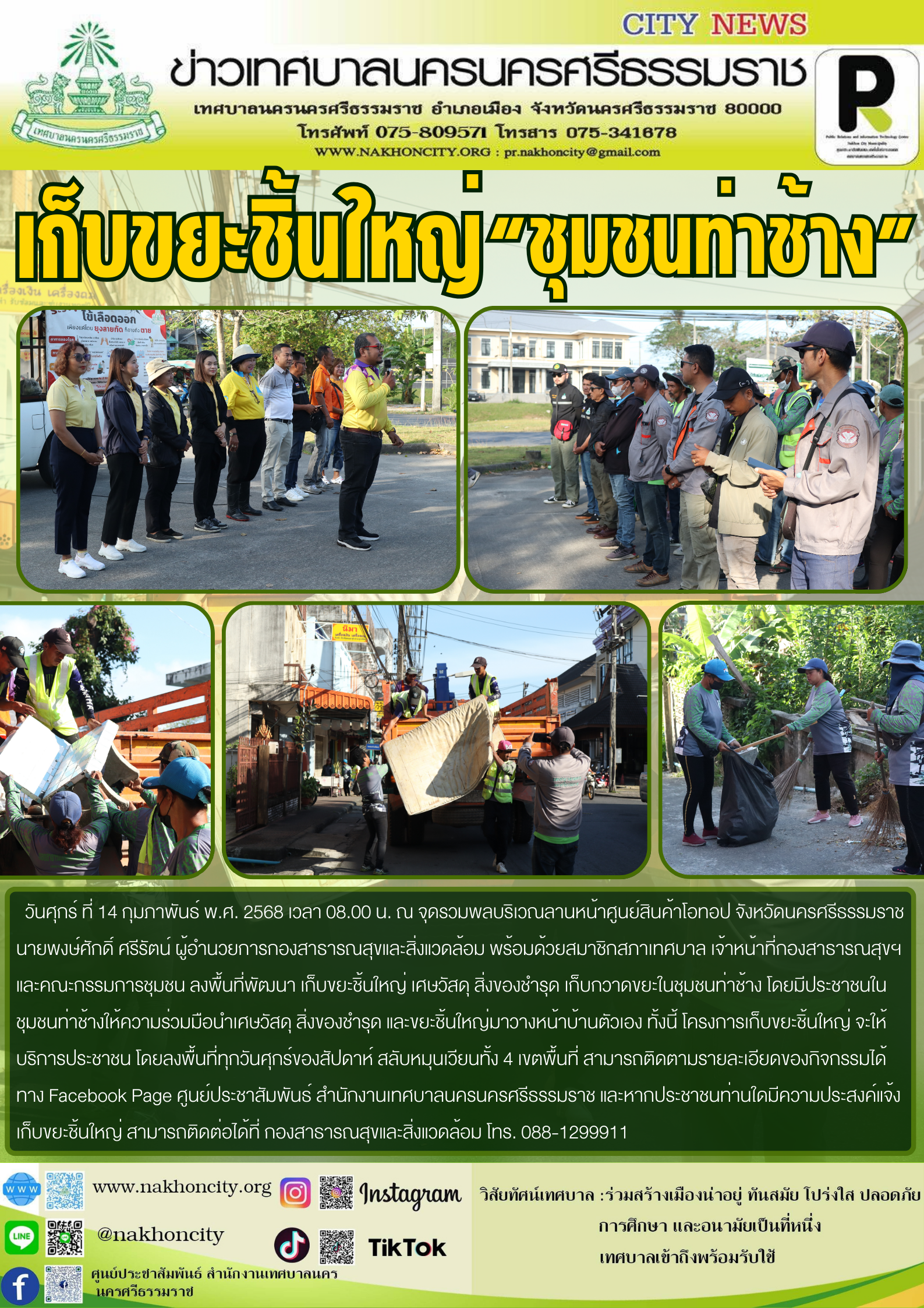 | วันศุกร์ ที่ 14 กุมภาพันธ์ พ.ศ. 2568 เวลา 08.00 น. ณ จุดรวมพลบริเวณลานหน้าศูนย์สินค้าโอทอป จังหวัดนครศรีธรรมราช นายพงษ์ศักดิ์ ศรีรัตน์ ผู้อำนวยการกองสาธารณสุขและสิ่งแวดล้อม พร้อมด้วยสมาชิกสภาเทศบาล เจ้าหน้าที่กองสาธารณสุขฯ และคณะกรรมการชุมชน ลงพื้นที่พัฒนา เก็บขยะชิ้นใหญ่ เศษวัสดุ สิ่งของชำรุด เก็บกวาดขยะในชุมชนท่าช้าง โดยมีประชาชนในชุมชนท่าช้างให้ความร่วมมือนำเศษวัสดุ สิ่งของชำรุด และขยะชิ้นใหญ่มาวางหน้าบ้านตัวเอง ทั้งนี้ โครงการเก็บขยะชิ้นใหญ่ จะให้บริการประชาชน โดยลงพื้นที่ทุกวันศุกร์ของสัปดาห์ สลับหมุนเวียนทั้ง 4 เขตพื้นที่ สามารถติดตามรายละเอียดของกิจกรรมได้ทาง Facebook Page ศูนย์ประชาสัมพันธ์ สำนักงานเทศบาลนครนครศรีธรรมราช และหากประชาชนท่านใดมีความประสงค์แจ้งเก็บขยะชิ้นใหญ่ สามารถติดต่อได้ที่ กองสาธารณสุขและสิ่งแวดล้อม โทร. 088-1299911 ภาพ //ข่าว : อรชุมา ตรวจทาน : ฐิตินันท์ |