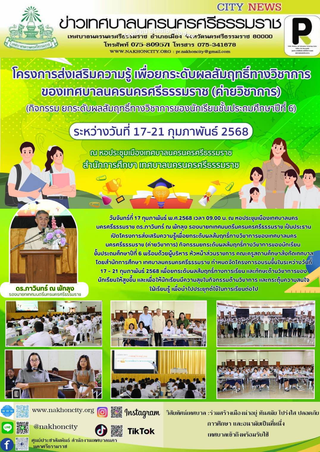 | วันจันทร์ที่ 17 กุมภาพันธ์ พ.ศ.2568 เวลา 09.00 น. ณ หอประชุมเมืองเทศบาลนครนครศรีธรรมราช ดร.ภาวินทร์ ณ พัทลุง รองนายกเทศมนตรีนครนครศรีธรรมราช เป็นประธานเปิดโครงการส่งเสริมความรู้เพื่อยกระดับผลสัมฤทธิ์ทางวิชาการของเทศบาลนครนครศรีธรรมราช (ค่ายวิชาการ) กิจกรรมยกระดับผลสัมฤทธิ์ทางวิชาการของนักเรียน ชั้นประถมศึกษาปีที่ 6 พร้อมด้วยผู้บริหาร หัวหน้าส่วนราชการ คณะครูสถานศึกษาสังกัดเทศบาล โดยสำนักการศึกษา เทศบาลนครนครศรีธรรมราช กำหนดจัดโครงการอบรมขึ้นในระหว่างวันที่ 17 – 21 กุมภาพันธ์ 2568 เพื่อยกระดับผลสัมฤทธิ์ทางการเรียน และทักษะด้านวิชาการของนักเรียนให้สูงขึ้น และเพื่อให้นักเรียนมีความสุขในกิจกรรมด้านวิชาการ และกระตุ้นความสนใจใฝ่เรียนรู้ เพื่อนำไปประยุกต์ใช้ในการเรียนต่อไป ................... ข่าว//จันทร์จิรา ภาพ/จันทร์จิรา/เจรจิรา/ปัญชนา(นักศึกษาฝึกงาน) ตรวจทาน//ฐิตินันท์ |