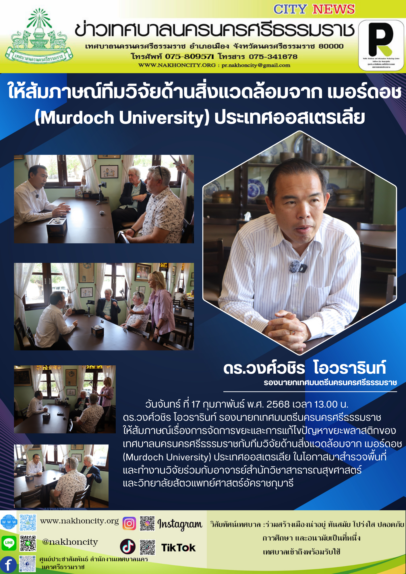 | วันจันทร์ที่ 17 กุมภาพันธ์ พ.ศ. 2568 เวลา 13.00 น. ดร.วงศ์วชิร โอวรารินท์ รองนายกเทศมนตรีนครนครศรีธรรมราช ให้สัมภาษณ์เรื่องการจัดการขยะและการแก้ไขปัญหาขยะพลาสติกของเทศบาลนครนครศรีธรรมราชกับทีมวิจัยด้านสิ่งแวดล้อมจาก เมอร์ดอช (Murdoch University) ประเทศออสเตรเลีย ในโอกาสมาสำรวจพื้นที่และทำงานวิจัยร่วมกับอาจารย์สำนักวิชาสาธารณสุขศาสตร์ และวิทยาลัยสัตวแพทย์ศาสตร์อัคราชกุมารี |