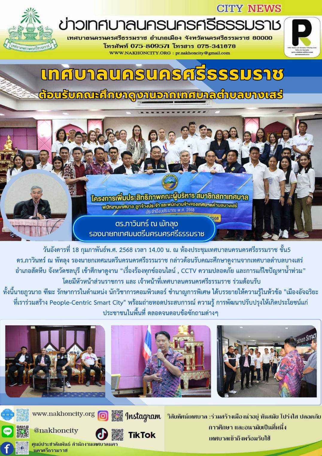 | วันอังคารที่ 18 กุมภาพันธ์ พ.ศ. 2568 เวลา 14.00 น. ณ ห้องประชุมเทศบาลนครนครศรีธรรมราช ชั้น5 ดร.ภาวินทร์ ณ พัทลุง รองนายกเทศมนตรีนครนครศรีธรรมราช กล่าวต้อนรับคณะศึกษาดูงานจากเทศบาลตำบลบางเสร่ อำเภอสัตหีบ จังหวัดชลบุรี เข้าศึกษาดูงาน “เรื่องร้องทุกข์ออนไลน์ , CCTV ความปลอดภัย และการแก้ไขปัญหาน้ำท่วม” โดยมีหัวหน้าส่วนราชการ และ เจ้าหน้าที่เทศบาลนครนครศรีธรรมราช ร่วมต้อนรับ ทั้งนี้นายภูวนาถ ฑีฆะ รักษาการในตำแหน่ง นักวิชาการคอมพิวเตอร์ ชำนาญการพิเศษ ได้บรรยายให้ความรู้ในห้วข้อ "เมืองอัจฉริยะที่เราร่วมสร้าง People-Centric Smart City" พร้อมถ่ายทอดประสบการณ์ ความรู้ การพัฒนาปรับปรุงให้เกิดประโยชน์แก่ประชาชนในพื้นที่ ตลอดจนตอบข้อซักถามต่างๆ ............... ภาพ//ข่าว//จันทร์จิรา ตรวจทาน//ฐิตินันท์ |