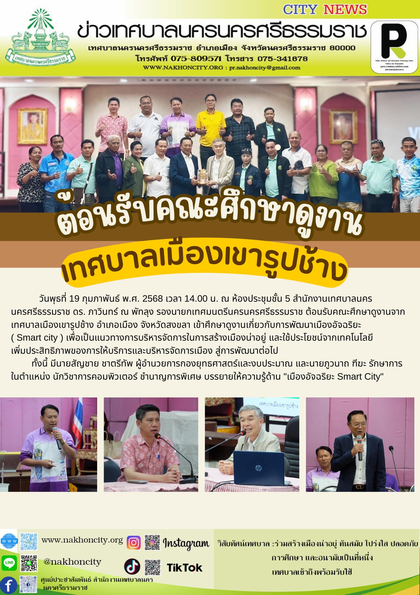 | วันพุธที่ 19 กุมภาพันธ์ พ.ศ. 2568 เวลา 14.00 น. ณ ห้องประชุมชั้น 5 สำนักงานเทศบาลนครนครศรีธรรมราช ดร. ภาวินทร์ ณ พัทลุง รองนายกเทศมนตรีนครนครศรีธรรมราช ต้อนรับคณะศึกษาดูงานจาก เทศบาลเมืองเขารูปช้าง อำเภอเมือง จังหวัดสงขลา เข้าศึกษาดูงานเกี่ยวกับการพัฒนาเมืองอัจฉริยะ ( Smart city ) เพื่อเป็นแนวทางการบริหารจัดการในการสร้างเมืองน่าอยู่ และใช้ประโยชน์จากเทคโนโลยี เพิ่มประสิทธิภาพของการให้บริการและบริหารจัดการเมือง สู่การพัฒนาต่อไป ทั้งนี้ นายสัญชาย ชาตรีทัพ ผู้อำนวยการกองยุทธศาสตร์และงบประมาณ และนายภูวนาถ ฑีฆะ รักษาการในตำแหน่ง นักวิชาการคอมพิวเตอร์ ชำนาญการพิเศษ บรรยายให้ความรู้ด้าน "เมืองอัจฉริยะ Smart City" |