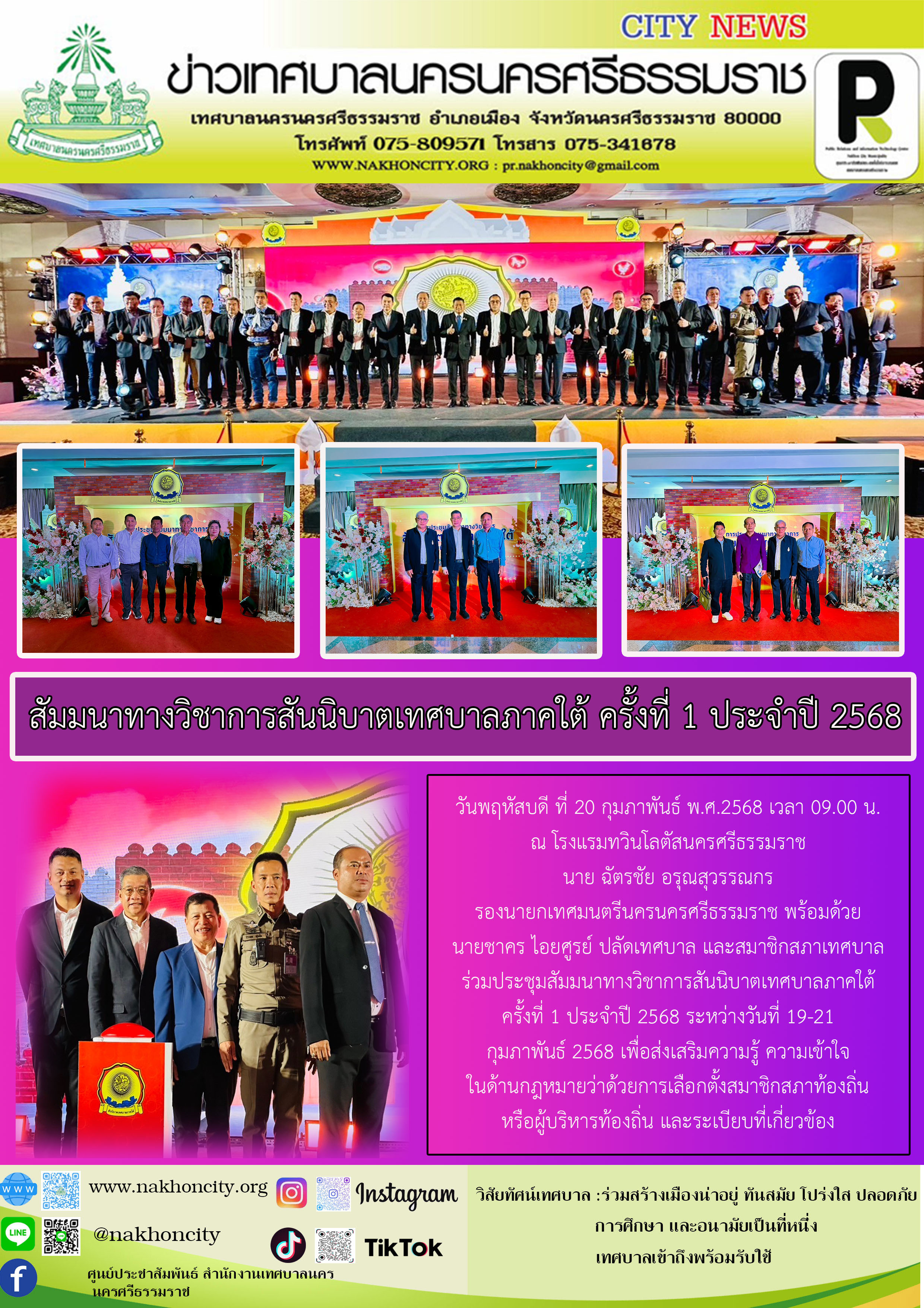 | รองนายกเทศมนตรีนครนครศรีธรรมราช พร้อมด้วย ปลัดเทศบาล และสมาชิกสภาเทศบาล ร่วมประชุมสัมมนาทางวิชาการสันนิบาตเทศบาลภาคใต้ ครั้งที่ 1 ประจำปี 2568 ระหว่างวันที่ 19-21 กุมภาพันธ์ 2568 |