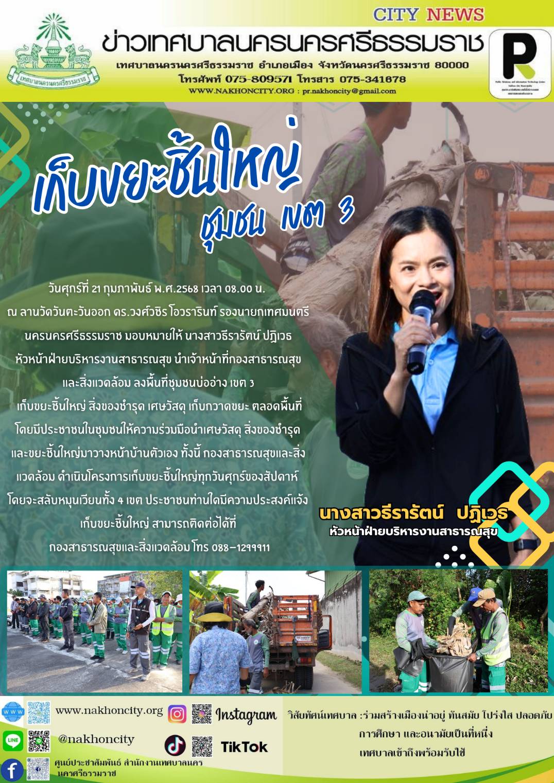 | วันศุกร์ที่ 21 กุมภาพันธ์ พ.ศ.2568 เวลา 08.00 น. ณ ลานวัดวันตะวันออก ดร.วงศ์วชิร โอวรารินท์ รองนายกเทศมนตรีนครนครศรีธรรมราช มอบหมายให้ นางสาวธีรารัตน์ ปฏิเวธ หัวหน้าฝ่ายบริหารงานสาธารณสุข นำเจ้าหน้าที่กองสาธารณสุขและสิ่งแวดล้อม ลงพื้นที่ชุมชนบ่ออ่าง เขต 3 เก็บขยะชิ้นใหญ่ สิ่งของชำรุด เศษวัสดุ เก็บกวาดขยะ ตลอดพื้นที่ โดยมีประชาชนในชุมชนให้ความร่วมมือนำเศษวัสดุ สิ่งของชำรุด และขยะชิ้นใหญ่มาวางหน้าบ้านตัวเอง ทั้งนี้ กองสาธารณสุขและสิ่งแวดล้อม ดำเนินโครงการเก็บขยะชิ้นใหญ่ทุกวันศุกร์ของสัปดาห์ โดยจะสลับหมุนเวียนทั้ง 4 เขต ประชาชนท่านใดมีความประสงค์แจ้งเก็บขยะชิ้นใหญ่ สามารถติดต่อได้ที่ กองสาธารณสุขและสิ่งแวดล้อม โทร 088-1299911 .............. ภาพ//ข่าว//จันทร์จิรา |