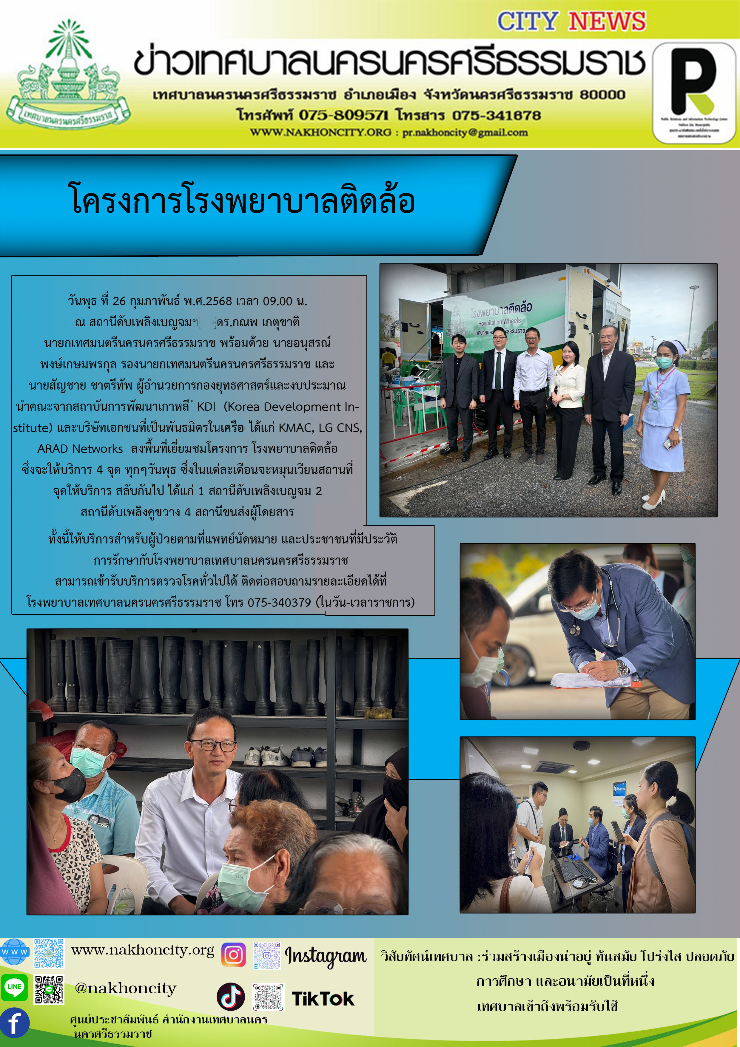 ดร.กณพ เกตุชาติ นายกเทศมนตรีนครนครศรีธรรมราช พร้อมด้วย นายอนุสรณ์ พงษ์เกษมพรกุล รองนายกเทศมนตรีนครนครศรีธรรมราช และนายสัญชาย ชาตรีทัพ ผู้อำนวยการกองยุทธศาสตร์และงบประมาณ นำคณะจากสถาบันการพัฒนาเกาหลี KDI  (Korea Development Institute) และบริษัทเอกชนที่เป็นพันธมิตรในเครือ ได้แก่ KMAC, LG CNS, ARAD Networks  ลงพื้นที่เยี่ยมชมโครงการโรงพยาบาลติดล้อ ซึ่งจะให้บริการ 4 จุด ทุกๆวันพุธ ซึ่งในแต่ละเดือนจะหมุนเวียนสถานที่ จุดให้บริการ สลับกันไป ได้แก่ 1 สถานีดับเพลิงเบญจม 2 สถานีดับเพลิงคูขวาง 3 ลานกีฬาข้างอุทยานการเรียนรู้สนามหน้าเมือง (CLP) 4 สถานีขนส่งผู้โดยสาร ทั้งนี้ให้บริการสำหรับผู้ป่วยตามที่แพทย์นัดหมาย และประชาชนที่มีประวัติการรักษากับโรงพยาบาลเทศบาลนครนครศรีธรรมราช สามารถเข้ารับบริการตรวจโรคทั่วไปได้ ติดต่อสอบถามรายละเอียดได้ที่ โรงพยาบาลเทศบาลนครนครศรีธรรมราช โทร 075-340379 (ในวัน-เวลาราชการ) |