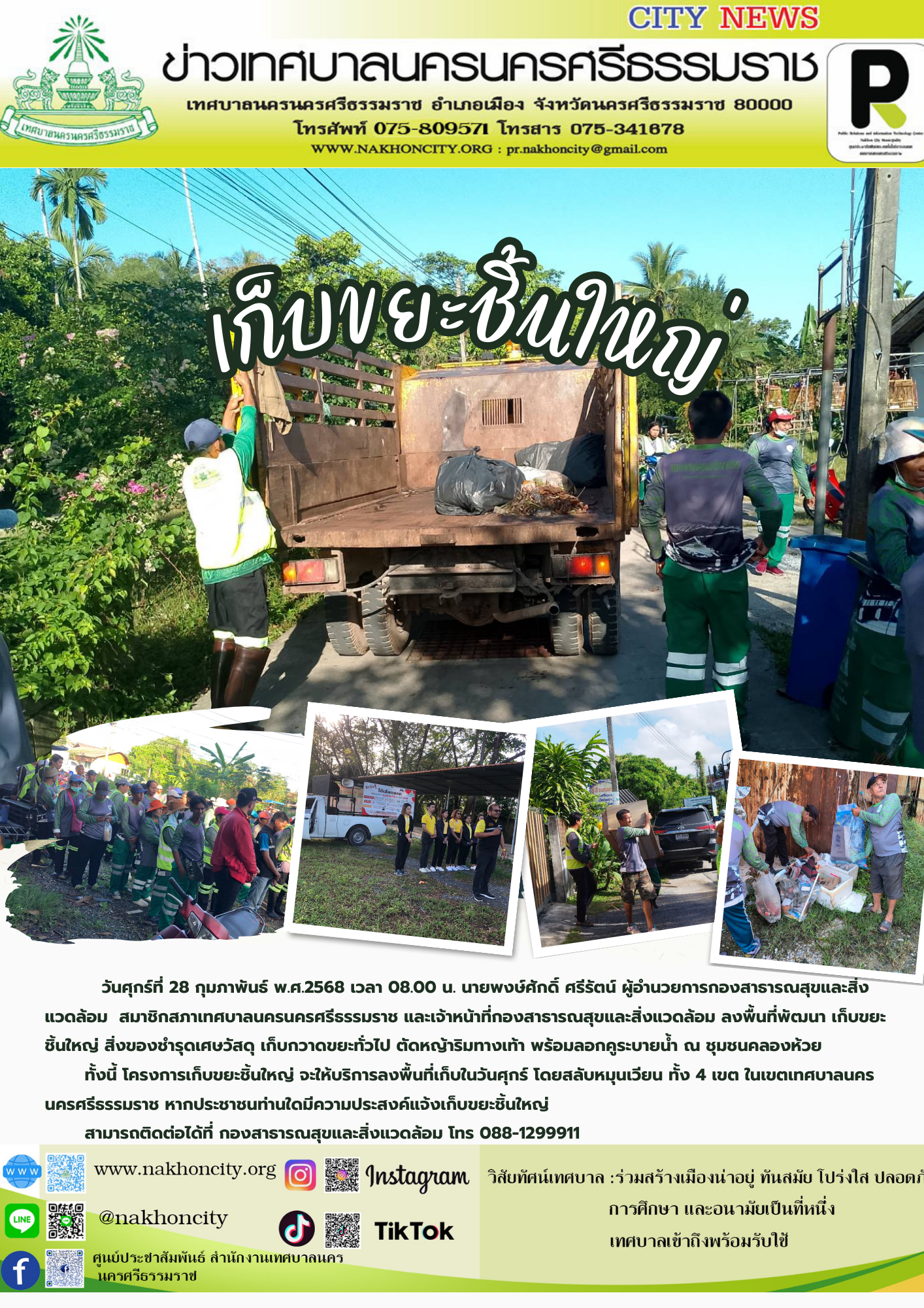 | นายพงษ์ศักดิ์ ศรีรัตน์ ผู้อำนวยการกองสาธารณสุขและสิ่งแวดล้อม สมาชิกสภาเทศบาลนครนครศรีธรรมราช และเจ้าหน้าที่กองสาธารณสุขและสิ่งแวดล้อม ลงพื้นที่พัฒนา เก็บขยะชิ้นใหญ่ สิ่งของชำรุดเศษวัสดุ เก็บกวาดขยะทั่วไป ตัดหญ้าริมทางเท้า พร้อมลอกคูระบายน้ำ ณ ชุมชนคลองห้วย |