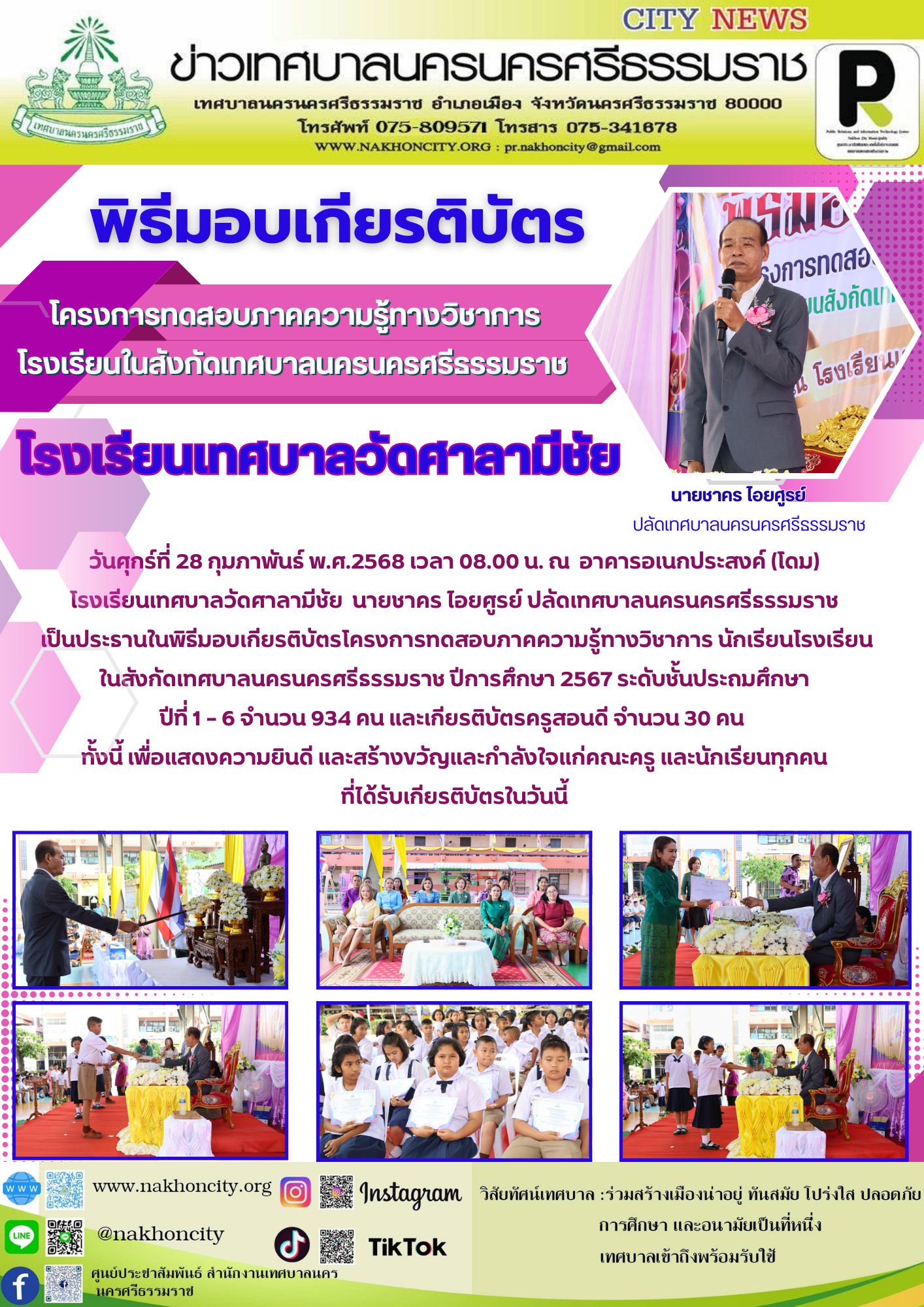 | วันศุกร์ที่ 28 กุมภาพันธ์ พ.ศ.2568 เวลา 08.30 น. ณ  อาคารอเนกประสงค์ (โดม)โรงเรียนเทศบาลวัดศาลามีชัย  นายชาคร ไอยศูรย์ ปลัดเทศบาลนครนครศรีธรรมราช เป็นประธานในพิธีมอบเกียรติบัตรโครงการทดสอบภาคความรู้ทางวิชาการ นักเรียนโรงเรียนในสังกัดเทศบาลนครนครศรีธรรมราช ปีการศึกษา 2567 ระดับชั้นประถมศึกษาปีที่ 1 – 6 จำนวน 934 คน และเกียรติบัตรครูสอนดี จำนวน 30 คน  |