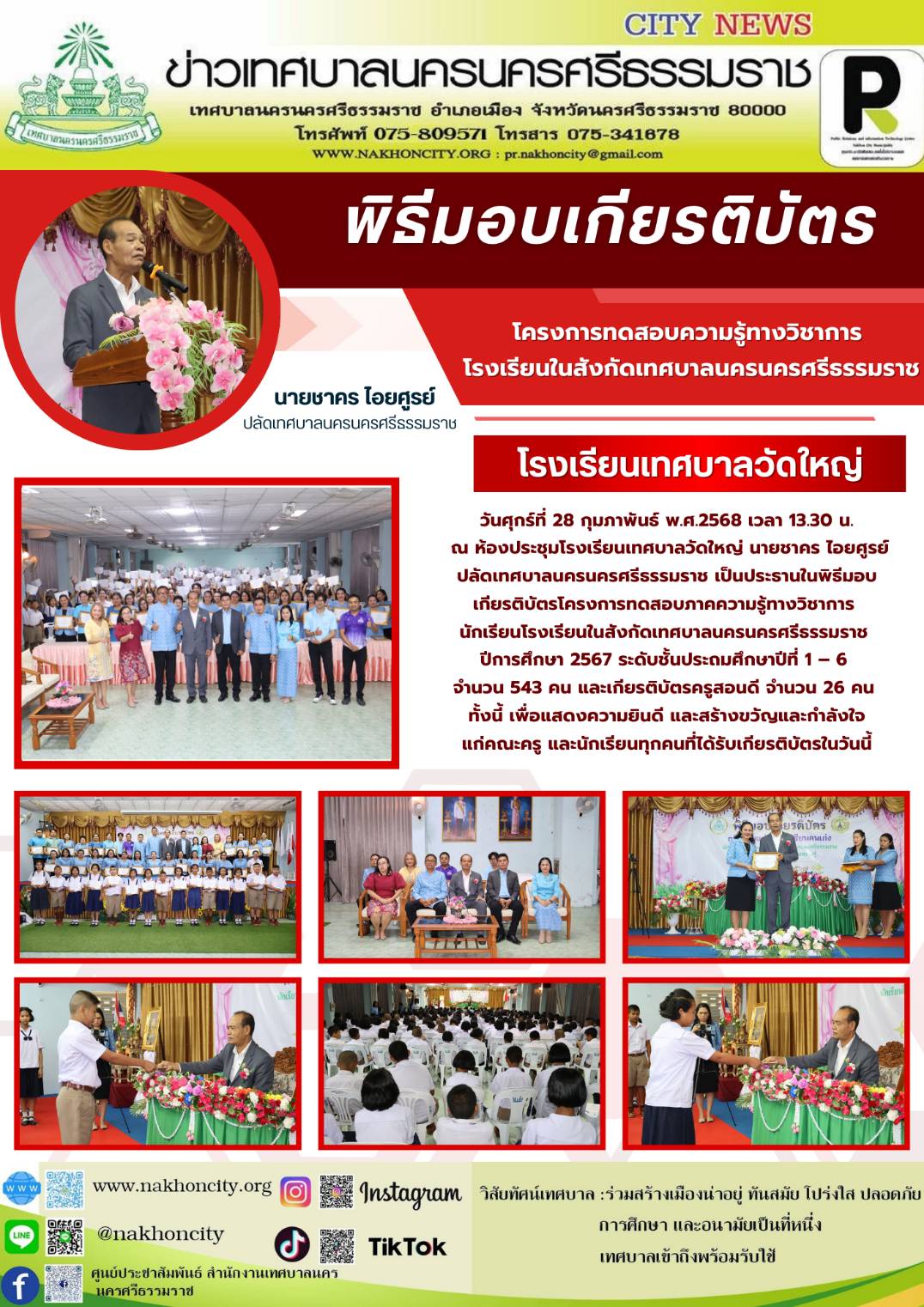 | นายชาคร ไอยศูรย์ ปลัดเทศบาลนครนครศรีธรรมราช เป็นประธานในพิธีมอบเกียรติบัตรโครงการทดสอบภาคความรู้ทางวิชาการ นักเรียนโรงเรียนเทศบาลวัดใหญ่ |