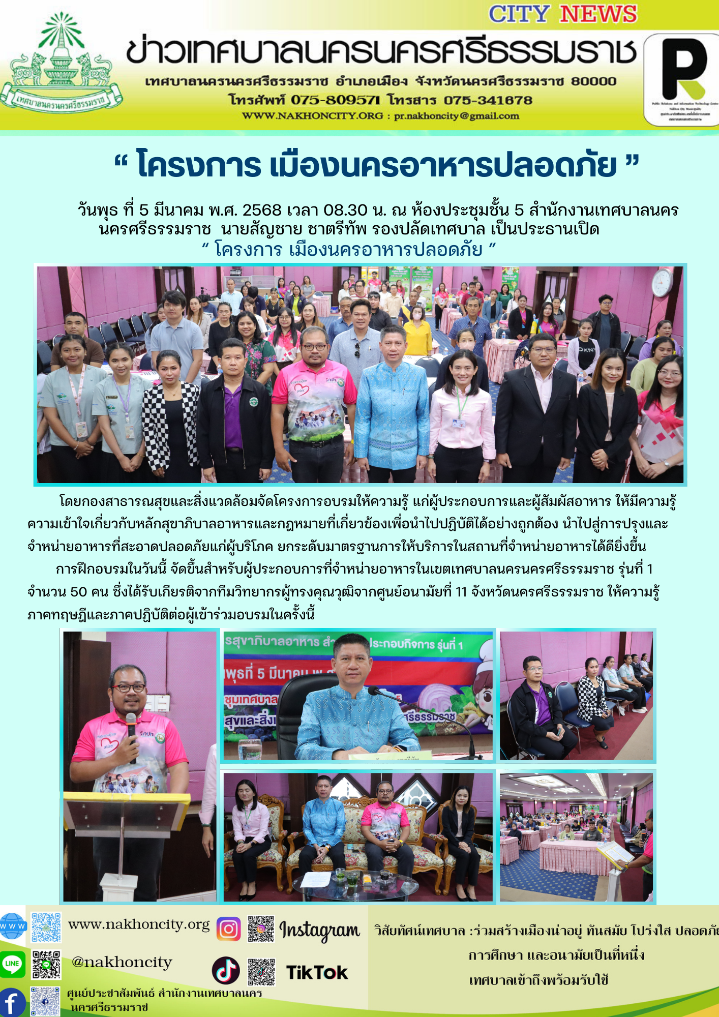 | วันพุธ ที่ 5 มีนาคม พ.ศ. 2568 เวลา 08.30 น. ณ ห้องประชุมชั้น5 สำนักงานเทศบาลนครนครศรีธรรมราช นายสัญชาย ชาตรีทัพ รองปลัดเทศบาล เป็นประธานเปิด “โครงการ เมืองนครอาหารปลอดภัย” โดยกองสาธารณสุขและสิ่งแวดล้อมจัดโครงการอบรมให้ความรู้ แก่ผู้ประกอบการและผู้สัมผัสอาหาร ให้มีความรู้ความเข้าใจเกี่ยวกับหลักสุขาภิบาลอาหารและกฎหมายที่เกี่ยวข้องเพื่อนำไปปฏิบัติได้อย่างถูกต้อง นำไปสู่การปรุงและจำหน่ายอาหารที่สะอาดปลอดภัยแก่ผู้บริโภค ยกระดับมาตรฐานการให้บริการในสถานที่จำหน่ายอาหารได้ดียิ่งขึ้น การฝึกอบรมในวันนี้ จัดขึ้นสำหรับผู้ประกอบการที่จำหน่ายอาหารในเขตเทศบาลนครนครศรีธรรมราช รุ่นที่ 1 จำนวน 50 คน ซึ่งได้รับเกียรติจากทีมวิทยากรผู้ทรงคุณวุฒิจากศูนย์อนามัยที่ 11 จังหวัดนครศรีธรรมราช ให้ความรู้ภาคทฤษฎีและภาคปฏิบัติต่อผู้เข้าร่วมอบรมในครั้งนี้ |