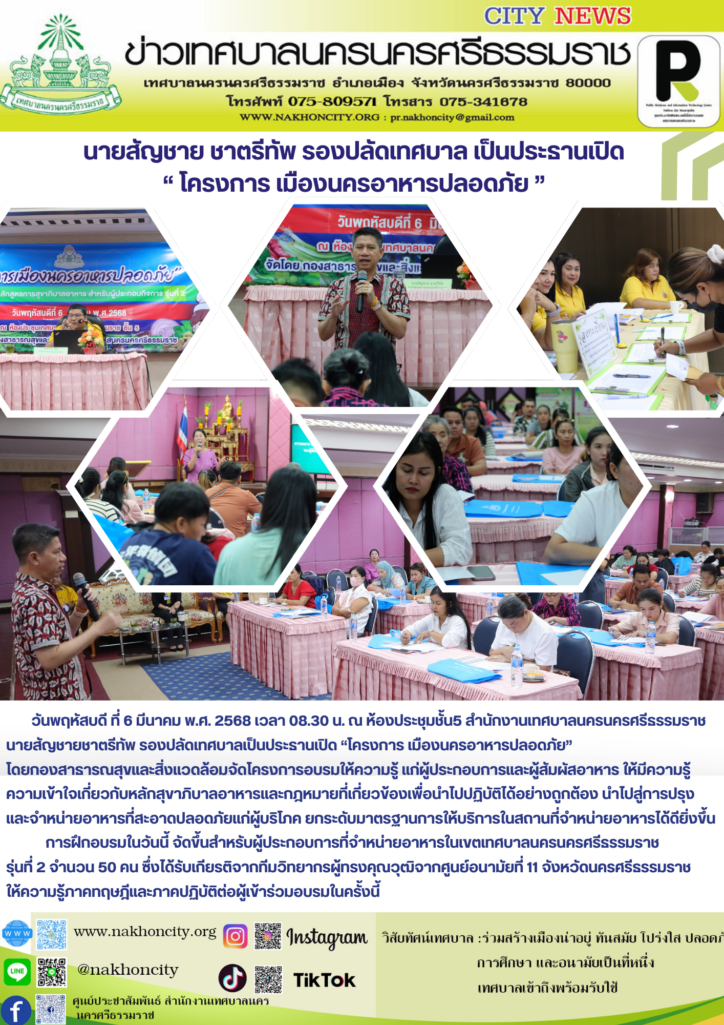 | วันพฤหัสบดีที่ 6 มีนาคม พ.ศ. 2568 เวลา 08.30 น. ณ ห้องประชุมชั้น5 สำนักงานเทศบาลนครนครศรีธรรมราช นายสัญชาย ชาตรีทัพ รองปลัดเทศบาล เป็นประธานเปิด “โครงการ เมืองนครอาหารปลอดภัย” โดยกองสาธารณสุขและสิ่งแวดล้อมจัดโครงการอบรมให้ความรู้ แก่ผู้ประกอบการและผู้สัมผัสอาหาร ให้มีความรู้ความเข้าใจเกี่ยวกับหลักสุขาภิบาลอาหารและกฎหมายที่เกี่ยวข้องเพื่อนำไปปฏิบัติได้อย่างถูกต้อง นำไปสู่การปรุงและจำหน่ายอาหารที่สะอาดปลอดภัยแก่ผู้บริโภค ยกระดับมาตรฐานการให้บริการในสถานที่จำหน่ายอาหารได้ดียิ่งขึ้น การฝึกอบรมในวันนี้ จัดขึ้นสำหรับผู้ประกอบการที่จำหน่ายอาหารในเขตเทศบาลนครนครศรีธรรมราช รุ่นที่ 2 จำนวน 50 คน ซึ่งได้รับเกียรติจากทีมวิทยากรผู้ทรงคุณวุฒิจากศูนย์อนามัยที่ 11 จังหวัดนครศรีธรรมราช ให้ความรู้ภาคทฤษฎีและภาคปฏิบัติต่อผู้เข้าร่วมอบรมในครั้งนี้ |