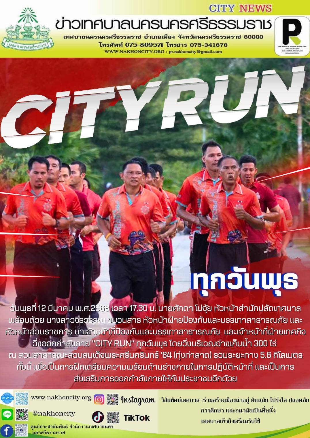 | นายศักดา โปจุ้ย หัวหน้าสำนักปลัดเทศบาล นำเจ้าหน้าที่ป้องกันและบรรเทาสาธารณภัย และเจ้าหน้าที่ฝ่ายเทศกิจ วิ่งออกกำลังกาย "CITY RUN" ทุกวันพุธ |