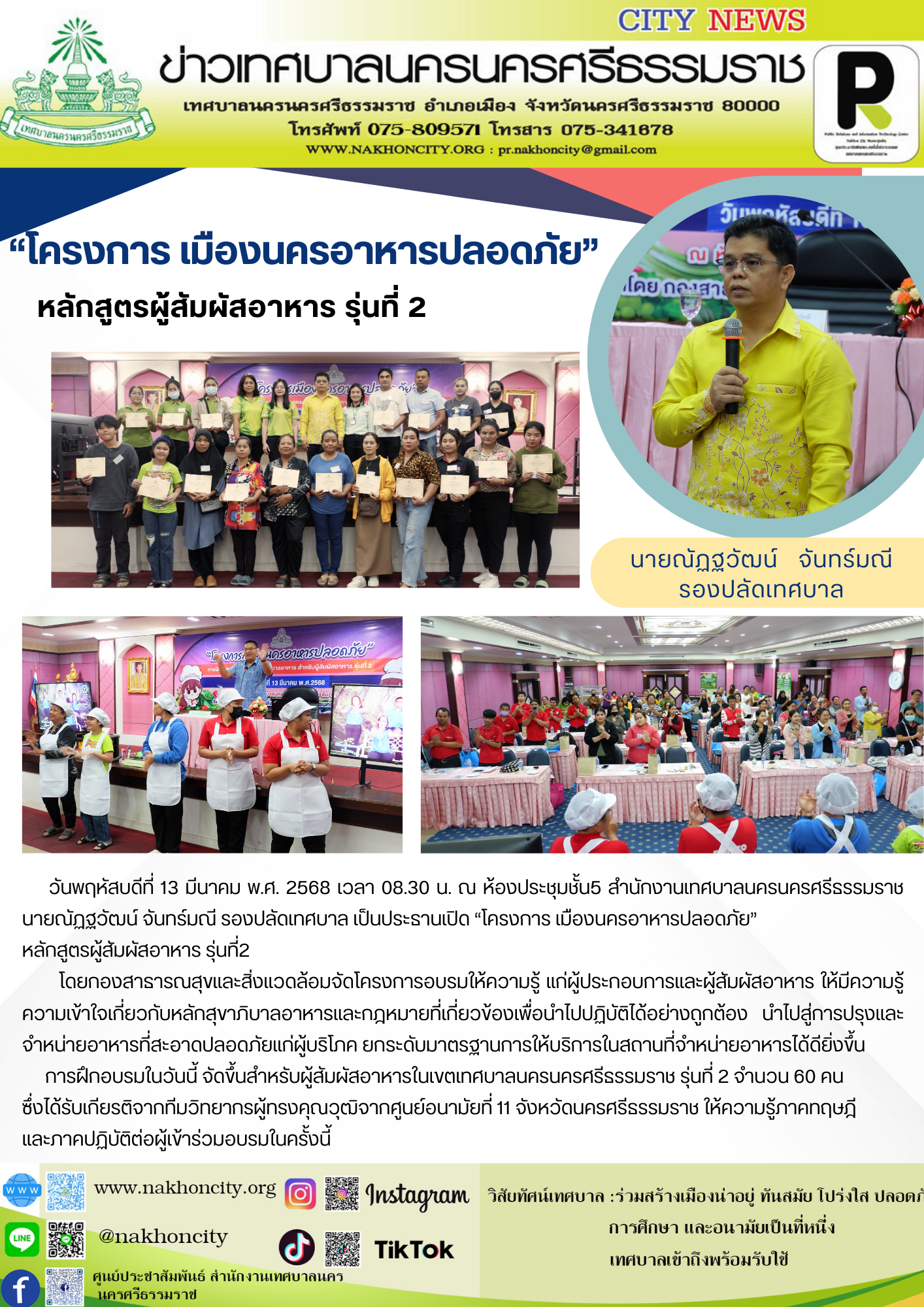 | วันพฤหัสบดีที่ 13 มีนาคม พ.ศ. 2568 เวลา 08.30 น. ณ ห้องประชุมชั้น5 สำนักงานเทศบาลนครนครศรีธรรมราช นายณัฏฐวัฒน์ จันทร์มณี รองปลัดเทศบาล เป็นประธานเปิด “โครงการ เมืองนครอาหารปลอดภัย” หลักสูตรผู้สัมผัสอาหาร รุ่นที่2 โดยกองสาธารณสุขและสิ่งแวดล้อมจัดโครงการอบรมให้ความรู้ แก่ผู้ประกอบการและผู้สัมผัสอาหาร ให้มีความรู้ความเข้าใจเกี่ยวกับหลักสุขาภิบาลอาหารและกฎหมายที่เกี่ยวข้องเพื่อนำไปปฏิบัติได้อย่างถูกต้อง นำไปสู่การปรุงและจำหน่ายอาหารที่สะอาดปลอดภัยแก่ผู้บริโภค ยกระดับมาตรฐานการให้บริการในสถานที่จำหน่ายอาหารได้ดียิ่งขึ้น การฝึกอบรมในวันนี้ จัดขึ้นสำหรับผู้สัมผัสอาหารในเขตเทศบาลนครนครศรีธรรมราช รุ่นที่ 2จำนวน 60 คน ซึ่งได้รับเกียรติจากทีมวิทยากรผู้ทรงคุณวุฒิจากศูนย์อนามัยที่ 11 จังหวัดนครศรีธรรมราช ให้ความรู้ภาคทฤษฎีและภาคปฏิบัติต่อผู้เข้าร่วมอบรมในครั้งนี้ |