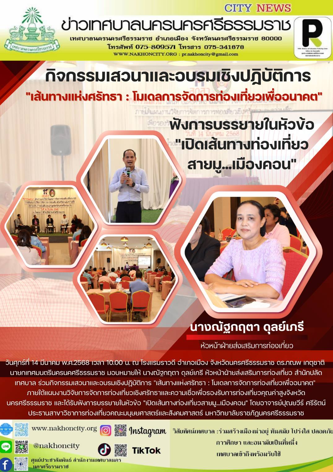 | วันศุกร์ทื่ 14 มีนาคม พ.ศ.2568 เวลา 10.00 น. ณ โรงแรมราวดี อำเภอเมือง จังหวัดนครศรีธรรมราช ดร.กณพ เกตุชาติ นายกเทศมนตรีนครนคศรีธรรมราช มอบหมายให้ นางณัฐกฤตา ดุลย์เภรี หัวหน้าฝ่ายส่งเสริมการท่องเที่ยว สำนักปลัดเทศบาล ร่วมกิจกรรมเสวนาและอบรมเชิงปฏิบัติการ "เส้นทางแห่งศรัทธา : โมเดลการจัดการท่องเที่ยวเพื่ออนาคต" ภายใต้แผนงานวิจัยการจัดการท่องเที่ยวเชิงศรัทธาและความเชื่อเพื่อรองรับการท่องเที่ยวคุณค่าสูงจังหวัดนครศรีธรรมราช และได้รับฟังการบรรยายในหัวข้อ "เปิดเส้นทางท่องเที่ยวสายมู...เมืองคอน" โดยอาจารย์ปุณยวีร์ ศรีรัตน์ ประธานสาขาวิชาการท่องเที่ยวคณะมนุษยศาสตร์และสังคมศาสตร์ มหาวิทยาลัยราชภัฏนครศรีธรรมราช ............ ภาพ//ข่าว//จันทร์จิรา ตรวจทาน//ฐิตินันท์ |