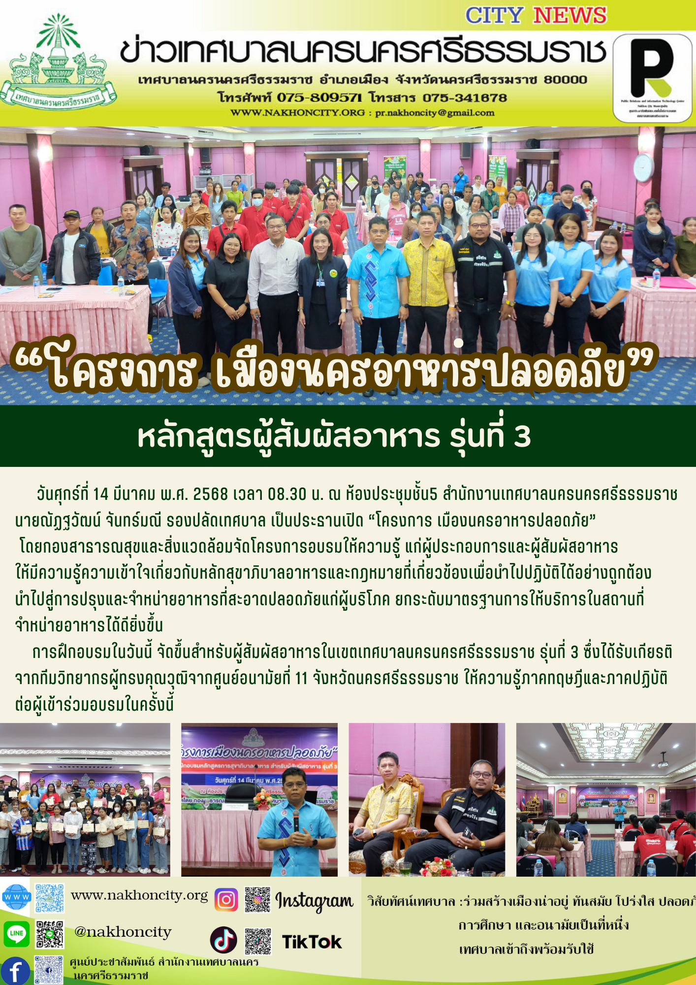 | วันศุกร์ที่ 14 มีนาคม พ.ศ. 2568 เวลา 08.30 น. ณ ห้องประชุมชั้น5 สำนักงานเทศบาลนครนครศรีธรรมราช นายณัฏฐวัฒน์ จันทร์มณี รองปลัดเทศบาล เป็นประธานเปิด “โครงการ เมืองนครอาหารปลอดภัย” หลักสูตรผู้สัมผัสอาหาร รุ่นที่ 3 โดยกองสาธารณสุขและสิ่งแวดล้อมจัดโครงการอบรมให้ความรู้ แก่ผู้ประกอบการและผู้สัมผัสอาหาร ให้มีความรู้ความเข้าใจเกี่ยวกับหลักสุขาภิบาลอาหารและกฎหมายที่เกี่ยวข้องเพื่อนำไปปฏิบัติได้อย่างถูกต้อง นำไปสู่การปรุงและจำหน่ายอาหารที่สะอาดปลอดภัยแก่ผู้บริโภค ยกระดับมาตรฐานการให้บริการในสถานที่จำหน่ายอาหารได้ดียิ่งขึ้น การฝึกอบรมในวันนี้ จัดขึ้นสำหรับผู้สัมผัสอาหารในเขตเทศบาลนครนครศรีธรรมราช รุ่นที่ 3 ซึ่งได้รับเกียรติจากทีมวิทยากรผู้ทรงคุณวุฒิจากศูนย์อนามัยที่ 11 จังหวัดนครศรีธรรมราช ให้ความรู้ภาคทฤษฎีและภาคปฏิบัติต่อผู้เข้าร่วมอบรมในครั้งนี้ |