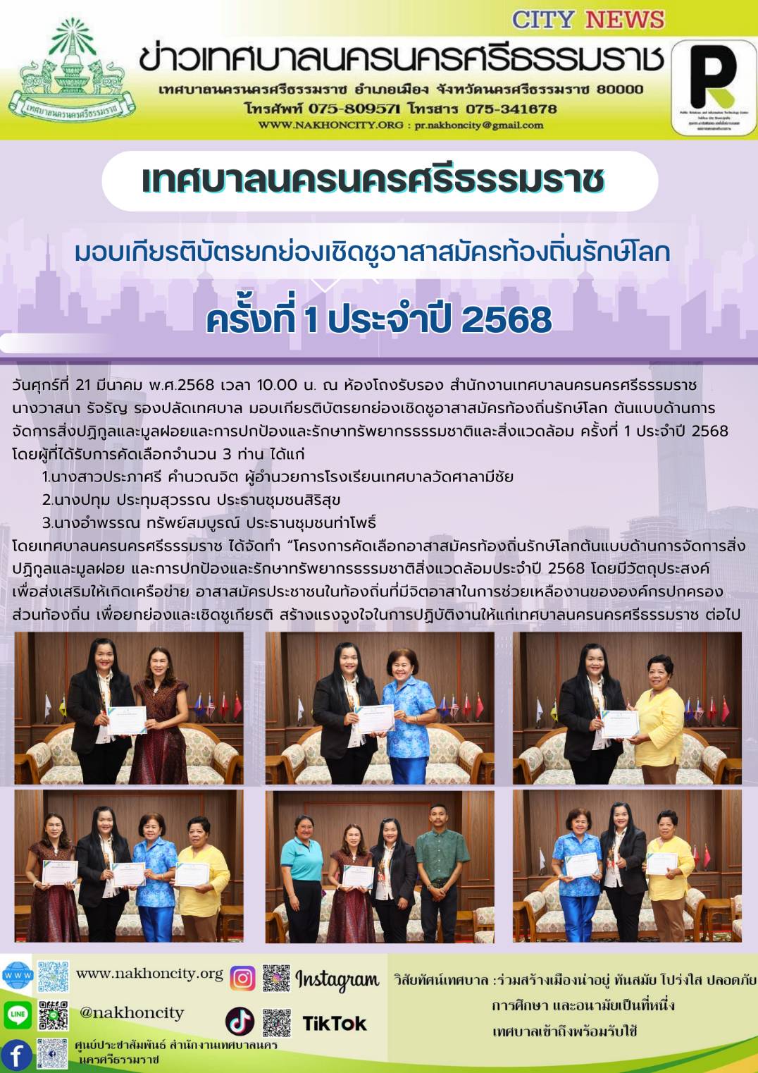 | วันศุกร์ที่ 21 มีนาคม พ.ศ.2568 เวลา 10.00 น. ณ ห้องโถงรับรอง สำนักงานเทศบาลนครนครศรีธรรมราช นางวาสนา รัจรัญ รองปลัดเทศบาล มอบเกียรติบัตรยกย่องเชิดชูอาสาสมัครท้องถิ่นรักษ์โลก ต้นแบบด้านการจัดการสิ่งปฏิกูลและมูลฝอยและการปกป้องและรักษาทรัพยากรธรรมชาติและสิ่งแวดล้อม ครั้งที่ 1 ประจำปี 2568 โดยผู้ที่ได้รับการคัดเลือกจำนวน 3 ท่าน ได้แก่