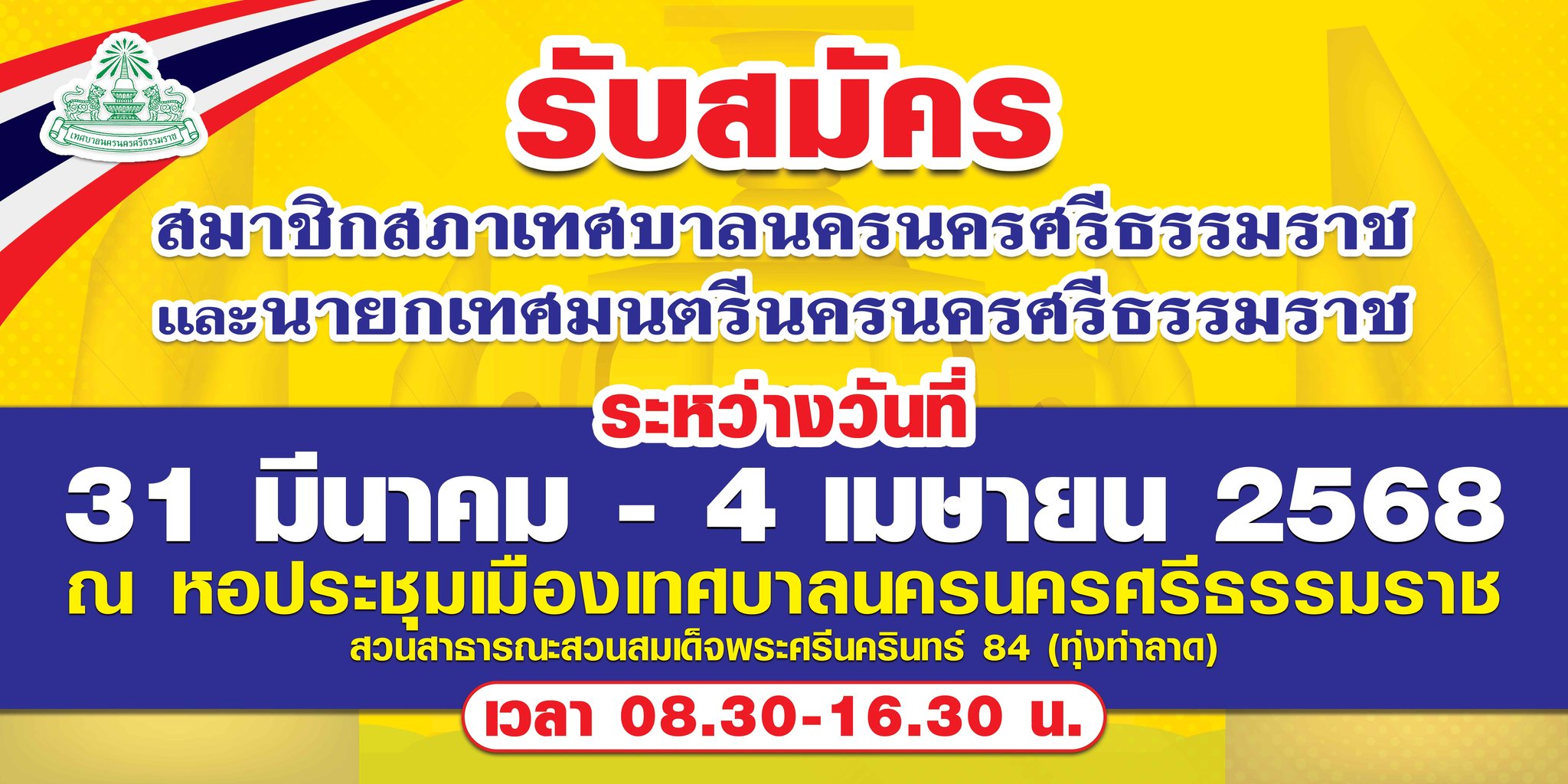 | เทศบาลนครนครศรีธรรมราช เปิดรับสมัคร สมาชิกสภาเทศบาลนครนครศรีธรรมราช และนายกเทศมนตรีนครนครศรีธรรมราช ระหว่างวันที่ 31มีนาคม -4 เมษายน 2568 ณ หอประชุมเมืองเทศบาลนครนครศรีธรรมราช สวนสาธารณะสวนสมเด็จพระศรีนครินทร์ ‘84 ( ทุ่งท่าลาด ) เวลา 08.30 – 16.30 น. สอบถามรายละเอียด และขอรับใบสมัครได้ที่ สำนักงานเทศบาลนครนครศรีธรรมราช โทรศัพท์ 075-809-571 ต่อ 9158 |