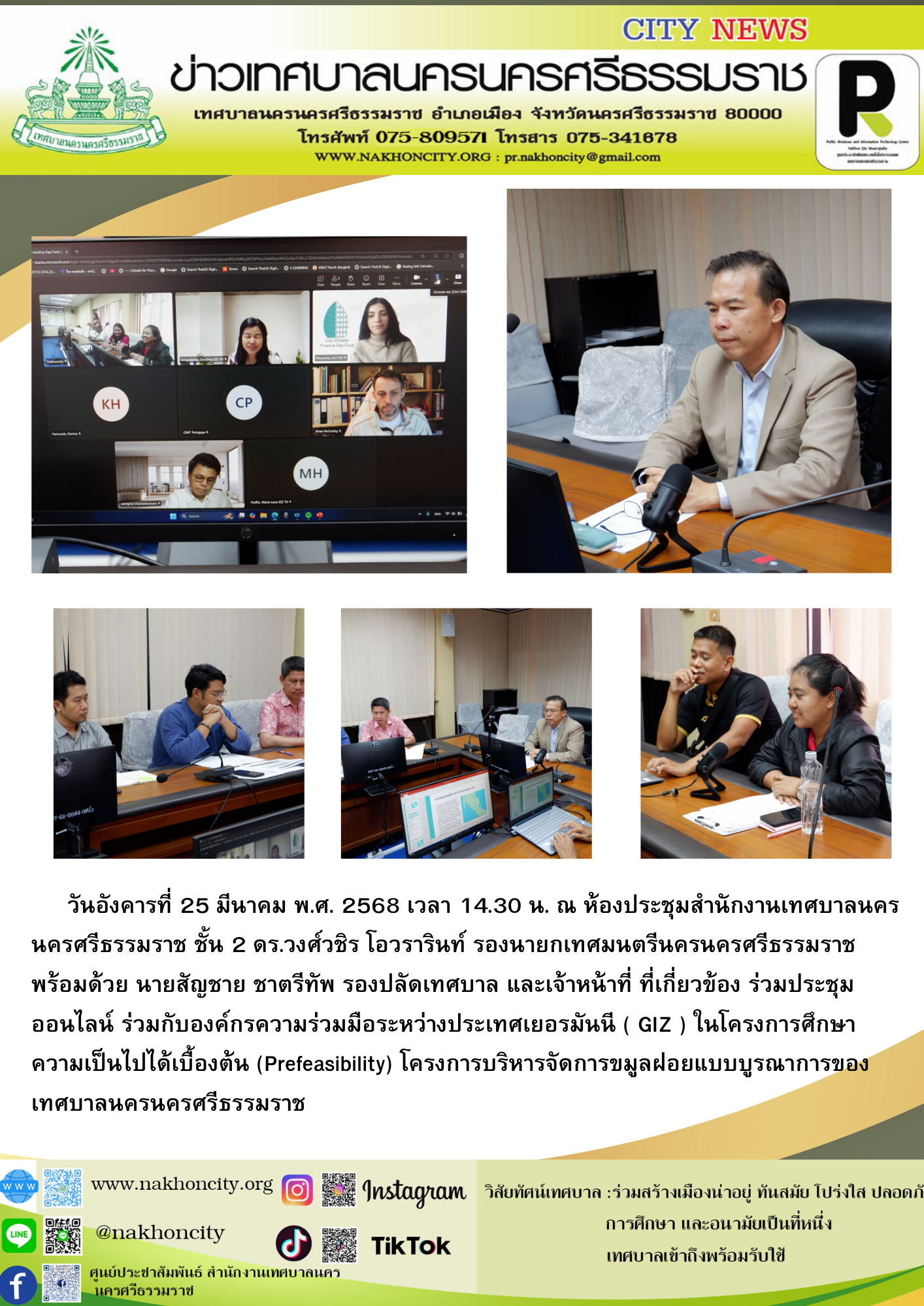 | วันอังคารที่ 25 มีนาคม พ.ศ. 2568 เวลา 14.30 น. ณ ห้องประชุมสำนักงานเทศบาลนครนครศรีธรรมราช ชั้น 2 ดร.วงศ์วชิร โอวรารินท์ รองนายกเทศมนตรีนครนครศรีธรรมราช พร้อมด้วย นายสัญชาย ชาตรีทัพ รองปลัดเทศบาล และเจ้าหน้าที่ ที่เกี่ยวข้อง ร่วมประชุมออนไลน์ ร่วมกับองค์กรความร่วมมือระหว่างประเทศเยอรมันนี ( GIZ ) ในโครงการศึกษาความเป็นไปได้เบื้องต้น (Prefeasibility) โครงการบริหารจัดการขมูลฝอยแบบบูรณาการของเทศบาลนครนครศรีธรรมราช |