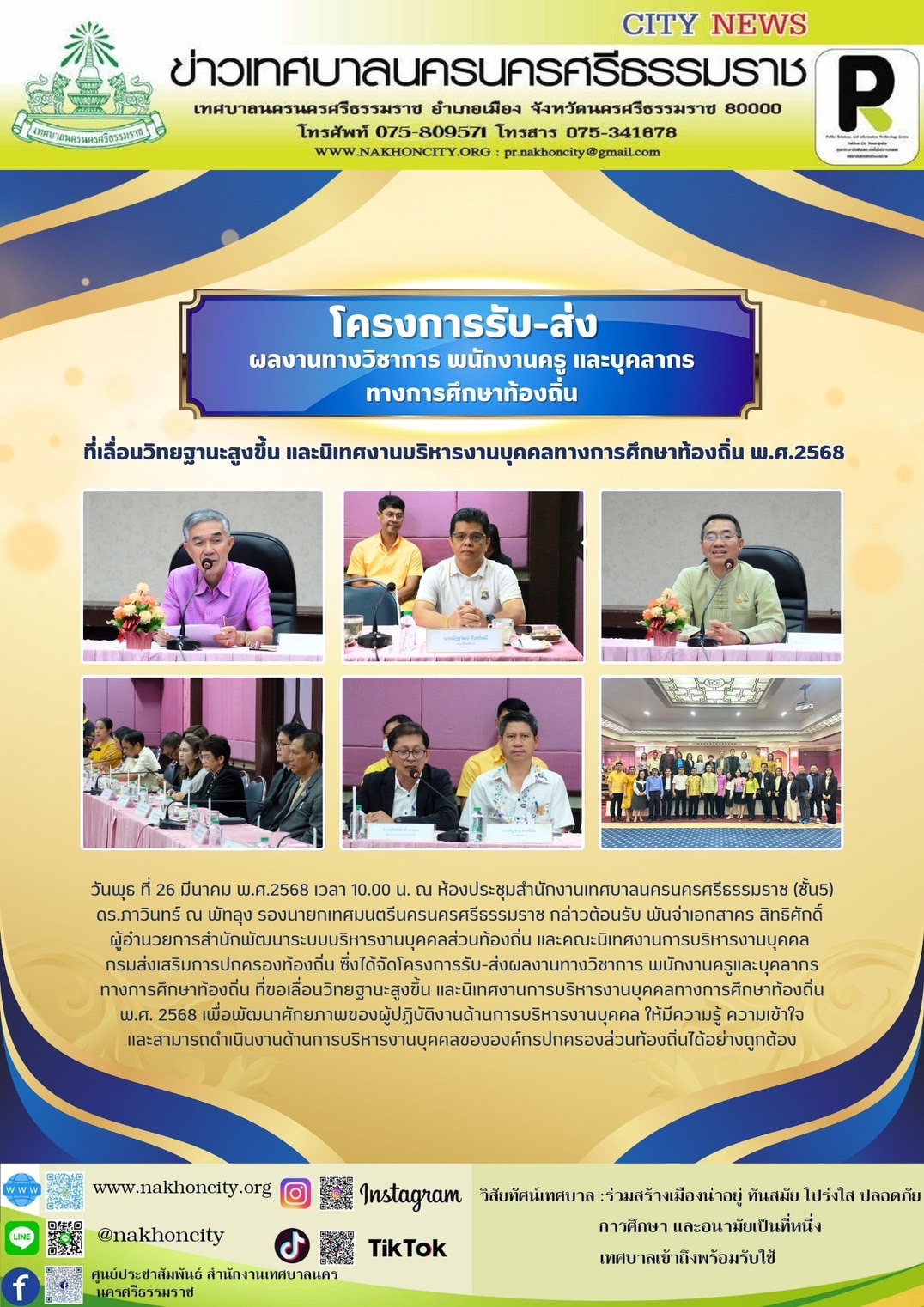 | วันพุธ ที่ 26 มีนาคม พ.ศ.2568 เวลา 10.00 น. ณ ห้องประชุมสำนักงานเทศบาลนครนครศรีธรรมราช (ชั้น5) ภาพ//ข่าว//ไกรสิทธิ//เจนจิรา//ปัญชนา(นักศึกษาฝึกงาน) |