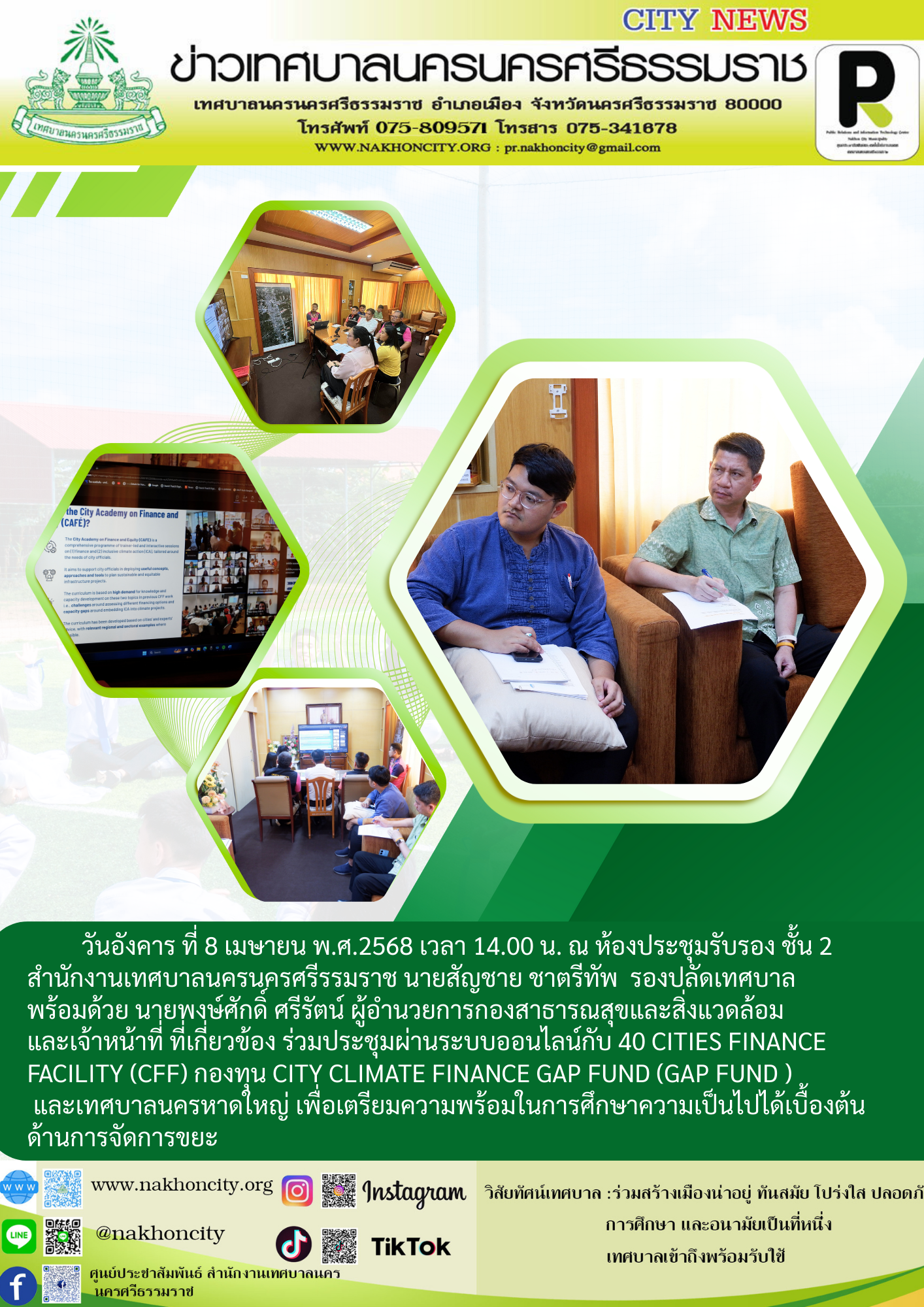 | วันอังคาร ที่ 8 เมษายน พ.ศ.2568 เวลา 14.00 น. ณ ห้องประชุมรับรอง ชั้น 2 สำนักงานเทศบาลนครนครศรีรรมราช นายสัญชาย ชาตรีทัพ รองปลัดเทศบาล พร้อมด้วย นายพงษ์ศักดิ์ ศรีรัตน์ ผู้อำนวยการกองสาธารณสุขและสิ่งแวดล้อม และเจ้าหน้าที่ ที่เกี่ยวข้อง ร่วมประชุมผ่านระบบออนไลน์กับ 40 Cities Finance Facility (CFF) กองทุน City Climate Finance Gap Fund (Gap Fund ) และเทศบาลนครหาดใหญ่ เพื่อเตรียมความพร้อมในการศึกษาความเป็นไปได้เบื้องต้นด้านการจัดการขยะ |