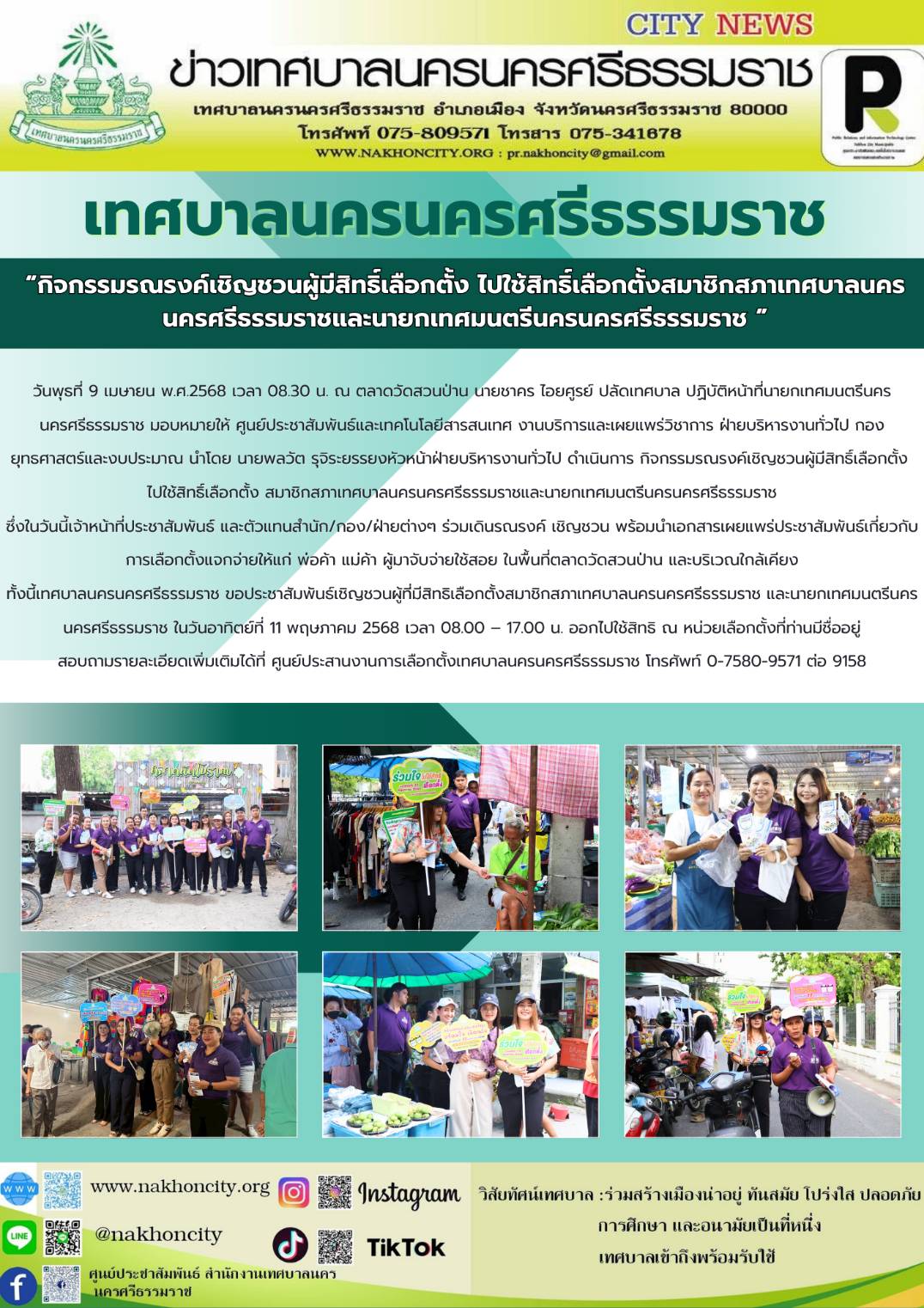 | เทศบาลนครนครศรีธรรมราช ดำเนินการ กิจกรรมรณรงค์เชิญชวนผู้มีสิทธิ์เลือกตั้ง ไปใช้สิทธิ์เลือกตั้ง สมาชิกสภาเทศบาลนครนครศรีธรรมราชและนายกเทศมนตรีนครนครศรีธรรมราช ณ วัดสวนป่าน |