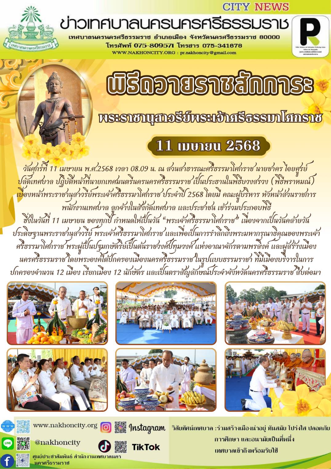| วันศุกร์ที่ 11 เมษายน พ.ศ.2568 เวลา 08.09 น. ณ สวนสาธารณะศรีธรรมาโศกราช นายชาคร ไอยศูรย์ ปลัดเทศบาล ปฏิบัติหน้าที่นายกเทศมนตรีนครนครศรีธรรมราช เป็นประธานในพิธีบวงสรวง (พิธีพราหมณ์) เบื้องหน้าพระราชานุสาวรีย์พระเจ้าศรีธรรมาโศกราช ประจำปี 2568 โดยมี คณะผู้บริหาร หัวหน้าส่วนราชการ พนักงานเทศบาล ลูกจ้างในสังกัดเทศบาล และประชาชน เข้าร่วมประกอบพิธี ซึ่งในวันที่ 11 เมษายน ของทุกปี กำหนดให้เป็นวัน “พระเจ้าศรีธรรมาโศกราช” เนื่องจากเป็นวันคล้ายวันประดิษฐานพระราชานุสาวรีย์ พระเจ้าศรีธรรมาโศกราช และเพื่อเป็นการรำลึกถึงพระมหากรุณาธิคุณของพระเจ้าศรีธรรมาโศกราช พระผู้เป็นปฐมกษัตริย์เป็นต้นราชวงศ์ปทุมวงศ์ แห่งอาณาจักรตามพรลิงค์ และผู้สร้างเมืองนครศรีธรรมราช โดยพระองค์ได้ปกครองเมืองนครศรีธรรมราช ในรูปแบบธรรมราชา ที่มีเมืองบริวารในการปกครองจำนวน 12 เมือง เรียกเมือง 12 นักษัตร และเป็นตราสัญลักษณ์ประจำจังหวัดนครศรีธรรมราช สืบต่อมา .................. ภาพ//ข่าว//จันทร์จิรา ตรวจทาน//ฐิตินันท์