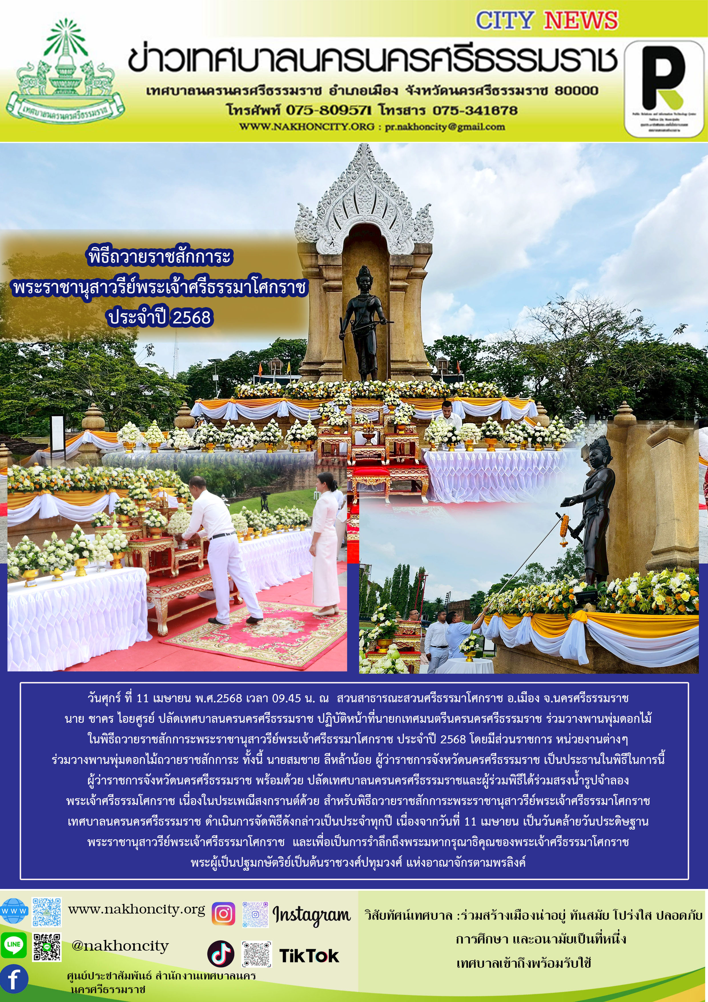 | ปลัดเทศบาลนครนครศรีธรรมราช ปฏิบัติหน้าที่นายกเทศมนตรีนครนครศรีธรรมราช ร่วมวางพานพุ่มดอกไม้ ในพิธีถวายราชสักการะพระราชานุสาวรีย์พระเจ้าศรีธรรมาโศกราช ประจำปี 2568 |