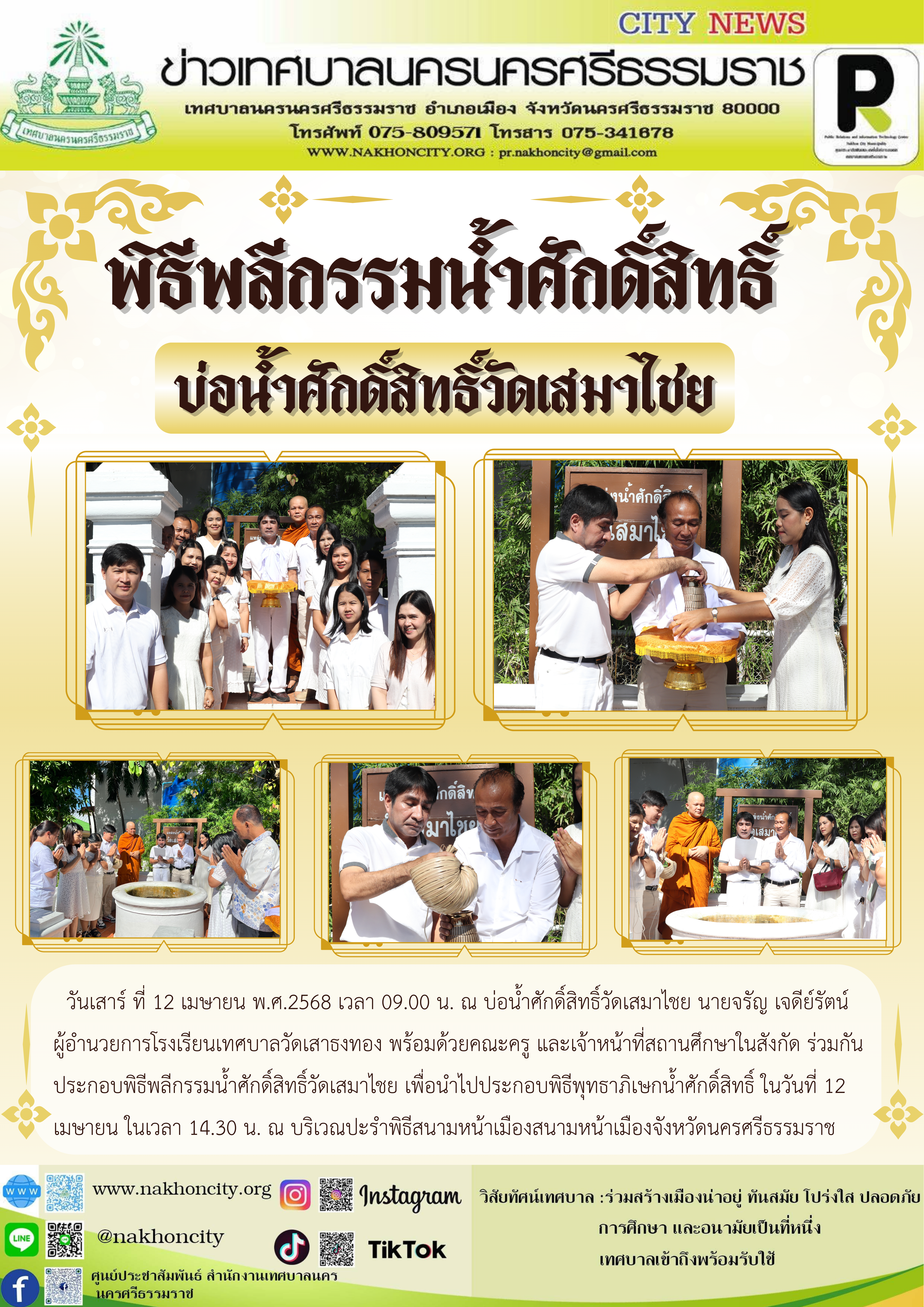 | วันเสาร์ ที่ 12 เมษายน พ.ศ.2568 เวลา 09.00 น. ณ บ่อน้ำศักดิ์สิทธิ์วัดเสมาไชย นายจรัญ เจดีย์รัตน์ ผู้อำนวยการโรงเรียนเทศบาลวัดเสาธงทอง พร้อมด้วยคณะครู และเจ้าหน้าที่สถานศึกษาในสังกัด ร่วมกันประกอบพิธีพลีกรรมน้ำศักดิ์สิทธิ์วัดเสมาไชย เพื่อนำไปประกอบพิธีพุทธาภิเษกน้ำศักดิ์สิทธิ์ ในวันที่ 12 เมษายน ในเวลา 14.30 น. ณ บริเวณปะรำพิธีสนามหน้าเมืองสนามหน้าเมืองจังหวัดนครศรีธรรมราช