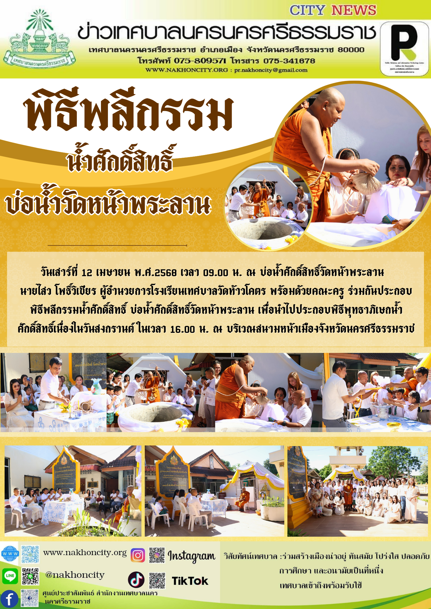 | วันเสาร์ที่ 12 เมษายน พ.ศ.2568 เวลา 09.00 น. ณ บ่อน้ำศักดิ์สิทธิ์วัดหน้าพระลาน นายไสว โพธิ์วิเชียร ผู้อำนวยการโรงเรียนเทศบาลวัดท้าวโคตร พร้อมด้วยคณะครู ร่วมกันประกอบพิธีพลีกรรมน้ำศักดิ์สิทธิ์ บ่อน้ำศักดิ์สิทธิ์วัดหน้าพระลาน เพื่อนำไปประกอบพิธีพุทธาภิเษกน้ำศักดิ์สิทธิ์เนื่องในวันสงกรานต์ ในเวลา 16.00 น. ณ บริเวณสนามหน้าเมืองจังหวัดนครศรีธรรมราช ................ ภาพ//ข่าว//จันทร์จิรา ตรวจทาน//ฐิตินันท์ |