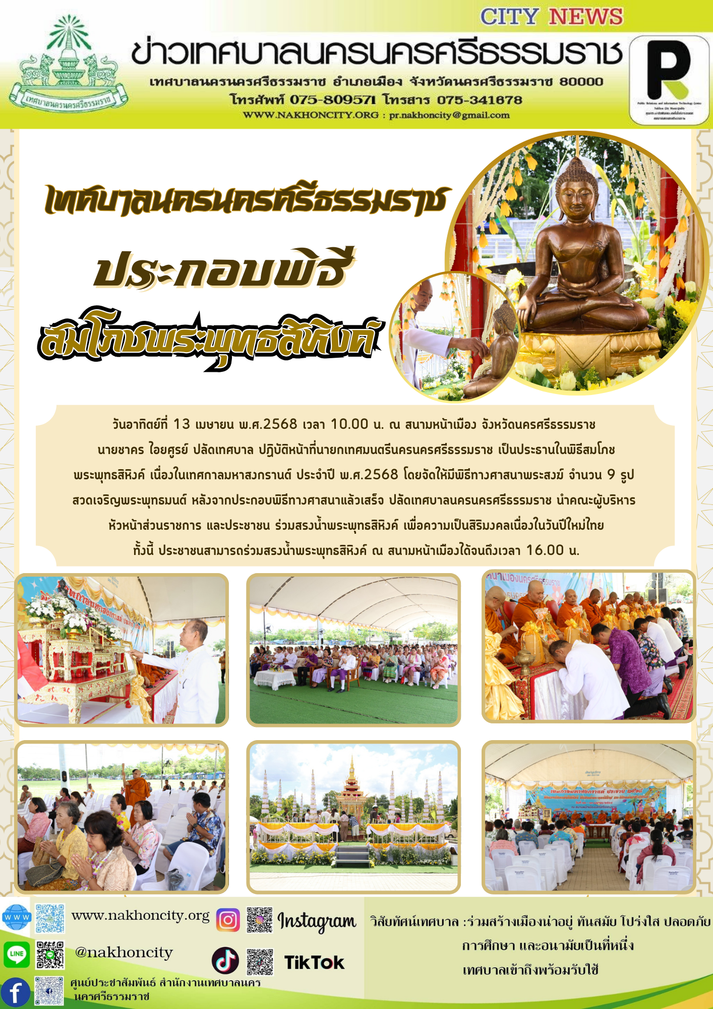 | วันอาทิตย์ที่ 13 เมษายน พ.ศ.2568 เวลา 10.00 น. ณ สนามหน้าเมือง จังหวัดนครศรีธรรมราช นายชาคร ไอยศูรย์ ปลัดเทศบาล ปฏิบัติหน้าที่นายกเทศมนตรีนครนครศรีธรรมราช เป็นประธานในพิธีสมโภชพระพุทธสิหิงค์ เนื่องในเทศกาลมหาสงกรานต์ ประจำปี พ.ศ.2568 โดยจัดให้มีพิธีทางศาสนาพระสงฆ์ จำนวน 9 รูป สวดเจริญพระพุทธมนต์ หลังจากประกอบพิธีทางศาสนาแล้วเสร็จ ปลัดเทศบาลนครนครศรีธรรมราช นำคณะผู้บริหาร หัวหน้าส่วนราชการ และประชาชน ร่วมสรงน้ำพระพุทธสิหิงค์ เพื่อความเป็นสิริมงคลเนื่องในวันปีใหม่ไทย ทั้งนี้ ประชาชนสามารถร่วมสรงน้ำพระพุทธสิหิงค์ ณ สนามหน้าเมืองได้จนถึงเวลา 16.00 น. ............... ภาพ//ข่าว//จันทร์จิรา ตรวจทาน//ฐิตินันท์ |