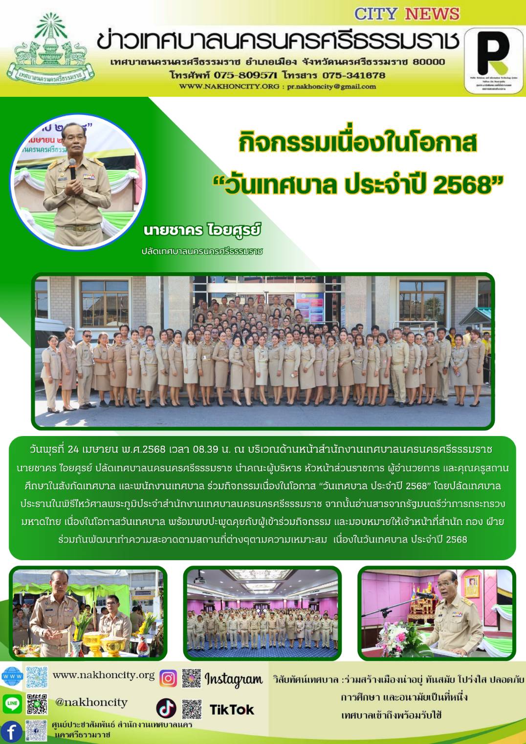 | นายชาคร ไอยศูรย์ ปลัดเทศบาลนครนครศรีธรรมราช ประธานกิจกรรมเนื่องในโอกาส “วันเทศบาล ประจำปี 2568” |