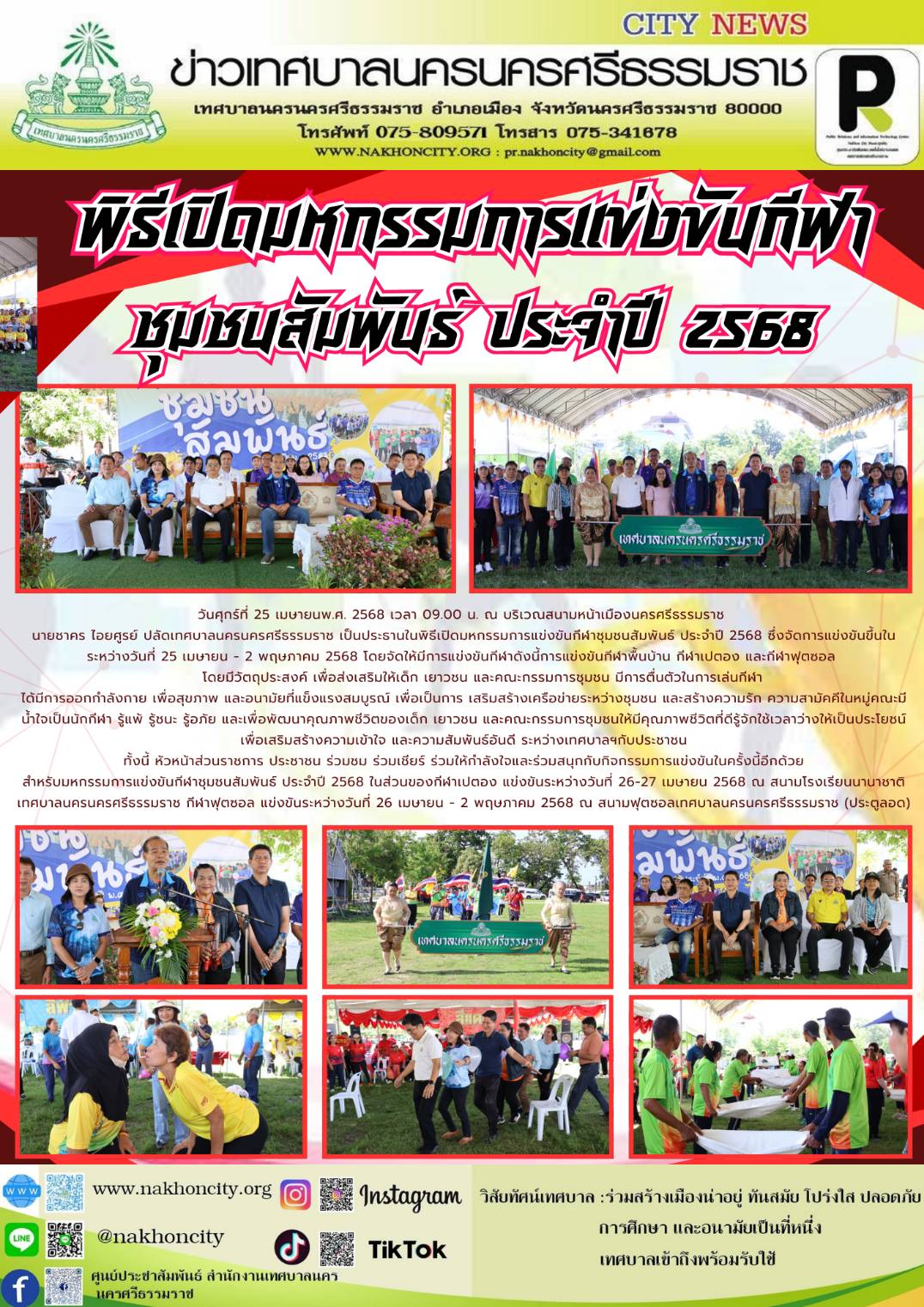 | นายชาคร ไอยศูรย์ ปลัดเทศบาลนครนครศรีธรรมราช เป็นประธานในพิธีเปิดมหกรรมการแข่งขันกีฬาชุมชนสัมพันธ์ ประจำปี 2568 |