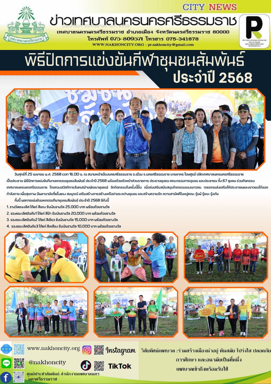 | นายชาคร ไอยศูรย์ ปลัดเทศบาลนครนครศรีธรรมราช เป็นประธานปิดการแข่งขันกีฬามหกรรมชุมชนสัมพันธ์ ประจำปี 2568 |