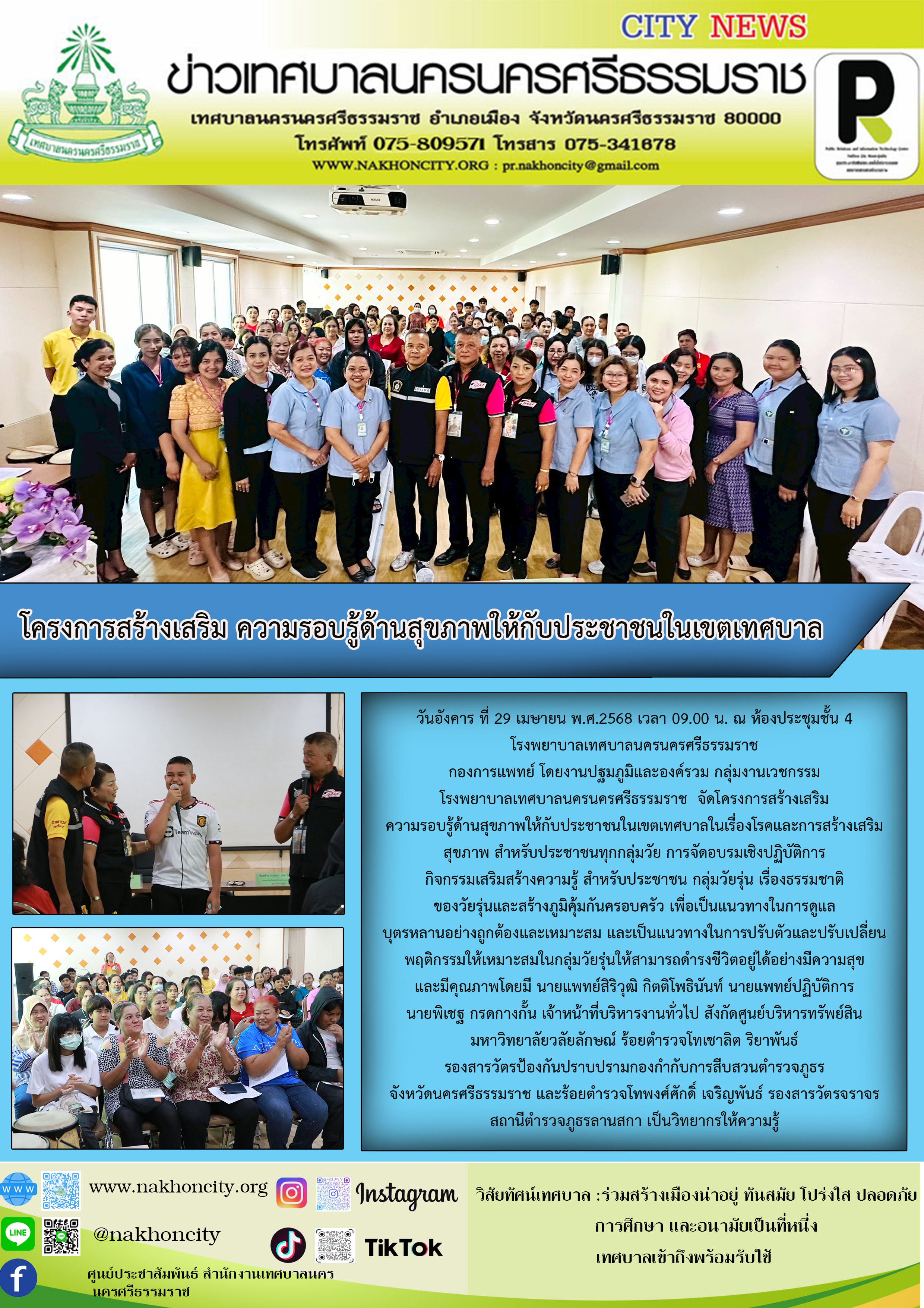 | โรงพยาบาลเทศบาลนครนครศรีธรรมราช จัดโครงการสร้างเสริมความรอบรู้ด้านสุขภาพให้กับประชาชนในเขตเทศบาลในเรื่องโรคและการสร้างเสริมสุขภาพ สำหรับประชาชนทุกกลุ่มวัย |