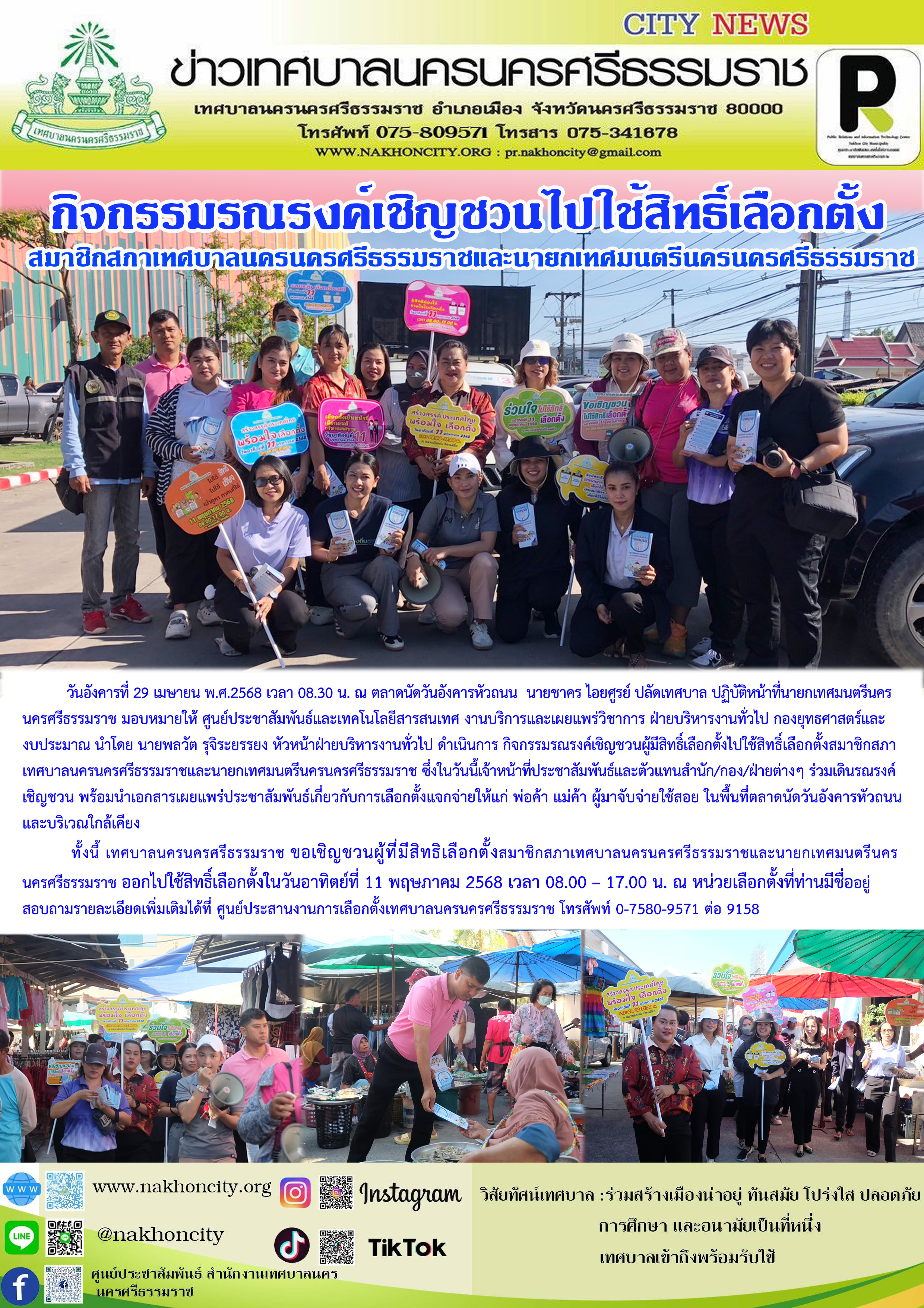 | วันอังคารที่ 29 เมษายน พ.ศ.2568 เวลา 08.30 น. ณ ตลาดนัดวันอังคารหัวถนน นายชาคร ไอยศูรย์ ปลัดเทศบาล ปฏิบัติหน้าที่นายกเทศมนตรีนครนครศรีธรรมราช มอบหมายให้ ศูนย์ประชาสัมพันธ์และเทคโนโลยีสารสนเทศ งานบริการและเผยแพร่วิชาการ ฝ่ายบริหารงานทั่วไป กองยุทธศาสตร์และงบประมาณ นำโดย นายพลวัต รุจิระยรรยง หัวหน้าฝ่ายบริหารงานทั่วไป ดำเนินการ กิจกรรมรณรงค์เชิญชวนผู้มีสิทธิ์เลือกตั้งไปใช้สิทธิ์เลือกตั้งสมาชิกสภาเทศบาลนครนครศรีธรรมราชและนายกเทศมนตรีนครนครศรีธรรมราช ซึ่งในวันนี้เจ้าหน้าที่ประชาสัมพันธ์และตัวแทนสำนัก/กอง/ฝ่ายต่างๆ ร่วมเดินรณรงค์ เชิญชวน พร้อมนำเอกสารเผยแพร่ประชาสัมพันธ์เกี่ยวกับการเลือกตั้งแจกจ่ายให้แก่ พ่อค้า แม่ค้า ผู้มาจับจ่ายใช้สอย ในพื้นที่ตลาดนัดวันอังคารหัวถนนและบริเวณใกล้เคียง ทั้งนี้ เทศบาลนครนครศรีธรรมราช ขอเชิญชวนผู้ที่มีสิทธิเลือกตั้งสมาชิกสภาเทศบาลนครนครศรีธรรมราชและนายกเทศมนตรีนครนครศรีธรรมราช ออกไปใช้สิทธิ์เลือกตั้งในวันอาทิตย์ที่ 11 พฤษภาคม 2568 เวลา 08.00 – 17.00 น. ณ หน่วยเลือกตั้งที่ท่านมีชื่ออยู่ สอบถามรายละเอียดเพิ่มเติมได้ที่ ศูนย์ประสานงานการเลือกตั้งเทศบาลนครนครศรีธรรมราช โทรศัพท์ 0-7580-9571 ต่อ 9158
