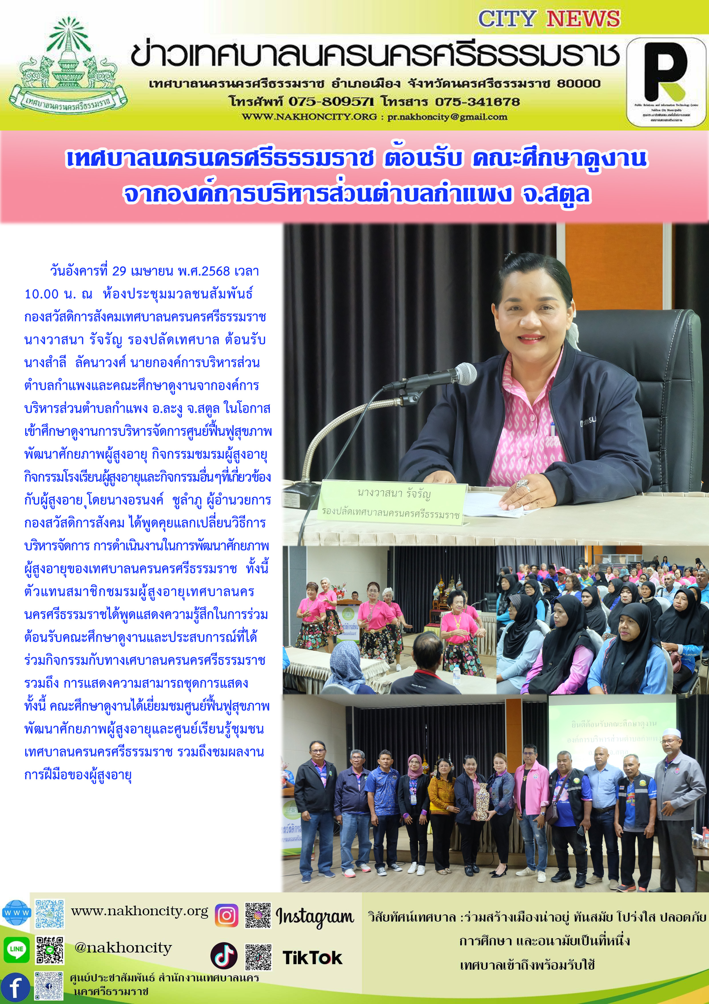 | วันอังคารที่ 29 เมษายน พ.ศ.2568 เวลา 10.00 น. ณ ห้องประชุมมวลชนสัมพันธ์ กองสวัสดิการสังคมเทศบาลนครนครศรีธรรมราช นางวาสนา รัจรัญ รองปลัดเทศบาล ต้อนรับนางสำลี ลัคนาวงศ์ นายกองค์การบริหารส่วนตำบลกำแพงและคณะศึกษาดูงานจากองค์การบริหารส่วนตำบลกำแพง อ.ละงู จ.สตูล ในโอกาสเข้าศึกษาดูงานการบริหารจัดการศูนย์ฟื้นฟูสุขภาพพัฒนาศักยภาพผู้สูงอายุ กิจกรรมชมรมผู้สูงอายุ กิจกรรมโรงเรียนผู้สูงอายุและกิจกรรมอื่นๆที่เกี่ยวข้องกับผู้สูงอายุโดยนางอรนงค์ ชูลำภู ผู้อำนวยการกองสวัสดิการสังคม ได้พูดคุยแลกเปลี่ยนวิธีการบริหารจัดการ การดำเนินงานในการพัฒนาศักยภาพผู้สูงอายุของเทศบาลนครนครศรีธรรมราช ทั้งนี้ ตัวแทนสมาชิกชมรมผู้สูงอายุเทศบาลนครนครศรีธรรมราชได้พูดแสดงความรู้สึกในการร่วมต้อนรับคณะศึกษาดูงานและประสบการณ์ที่ได้ร่วมกิจกรรมกับทางเศบาลนครนครศรีธรรมราช รวมถึง การแสดงความสามารถชุดการแสดง ทั้งนี้ คณะศึกษาดูงานได้เยี่ยมชมศูนย์ฟื้นฟูสุขภาพพัฒนาศักยภาพผู้สูงอายุและศูนย์เรียนรู้ชุมชน เทศบาลนครนครศรีธรรมราช รวมถึงชมผลงานการฝีมือของผู้สูงอายุ |