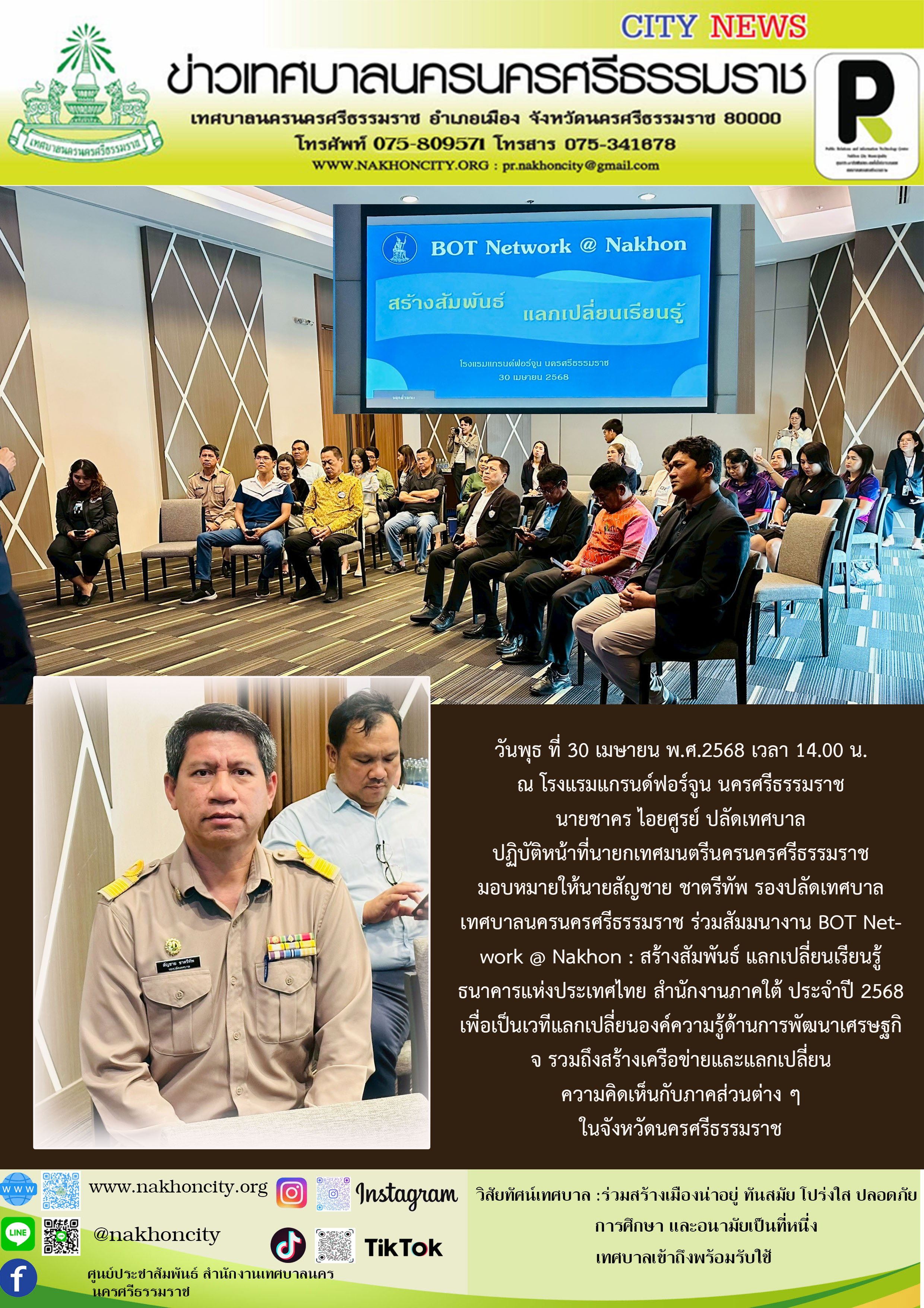 | เทศบาลนครนครศรีธรรมราช ร่วมสัมมนางาน BOT Network @ Nakhon : สร้างสัมพันธ์ แลกเปลี่ยนเรียนรู้ ธนาคารแห่งประเทศไทย สำนักงานภาคใต้ ประจำปี 2568 |