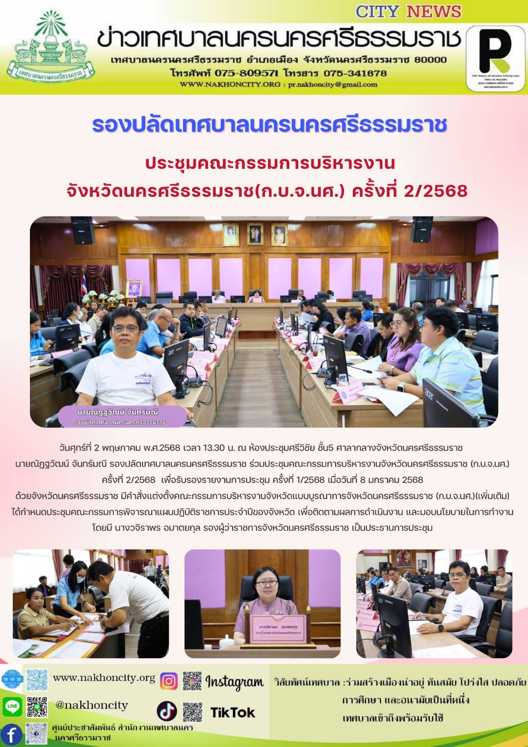 | วันศุกร์ที่ 2 พฤษภาคม พ.ศ.2568 เวลา 13.30 น. ณ ห้องประชุมศรีวิชัย ชั้น5 ศาลากลางจังหวัดนครศรีธรรมราช นายณัฏฐวัฒน์ จันทร์มณี รองปลัดเทศบาลนครนครศรีธรรมราช ร่วมประชุมคณะกรรมการบริหารงานจังหวัดนครศรีธรรมราช (ก.บ.จ.นศ.) ครั้งที่ 2/2568 เพื่อรับรองรายงานการประชุม ครั้งที่ 1/2568 เมื่อวันที่ 8 มกราคม 2568 ด้วยจังหวัดนครศรีธรรมราช มีคำสั่งแต่งตั้งคณะกรรมการบริหารงานจังหวัดแบบบูรณาการจังหวัดนครศรีธรรมราช (ก.บ.จ.นศ.)(เพิ่มเติม) ได้กำหนดประชุมคณะกรรมการพิจารณาแผนปฏิบัติราชการประจำปีของจังหวัด เพื่อติดตามผลการดำเนินงาน และมอบนโยบายในการทำงาน โดยมี นางวจิราพร อมาตยกุล รองผู้ว่าราชการจังหวัดนครศรีธรรมราช เป็นประธานการประชุม ............. ภาพ//ข่าว//จันทร์จิรา ตรวจทาน//ฐิตินันท์ |