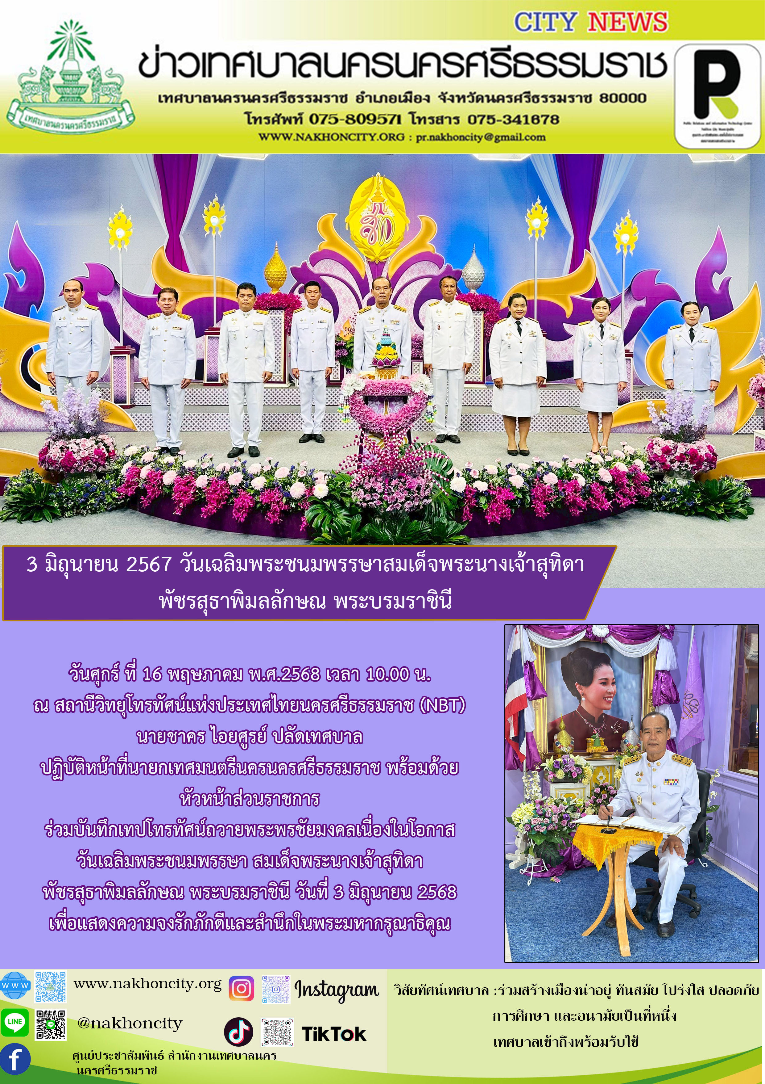 | เทศบาลนครนครศรีธรรมราช ร่วมบันทึกเทปโทรทัศน์ถวายพระพรชัยมงคลเนื่องในโอกาสวันเฉลิมพระชนมพรรษา สมเด็จพระนางเจ้าสุทิดา พัชรสุธาพิมลลักษณ พระบรมราชินี วันที่ 3 มิถุนายน 2568 |