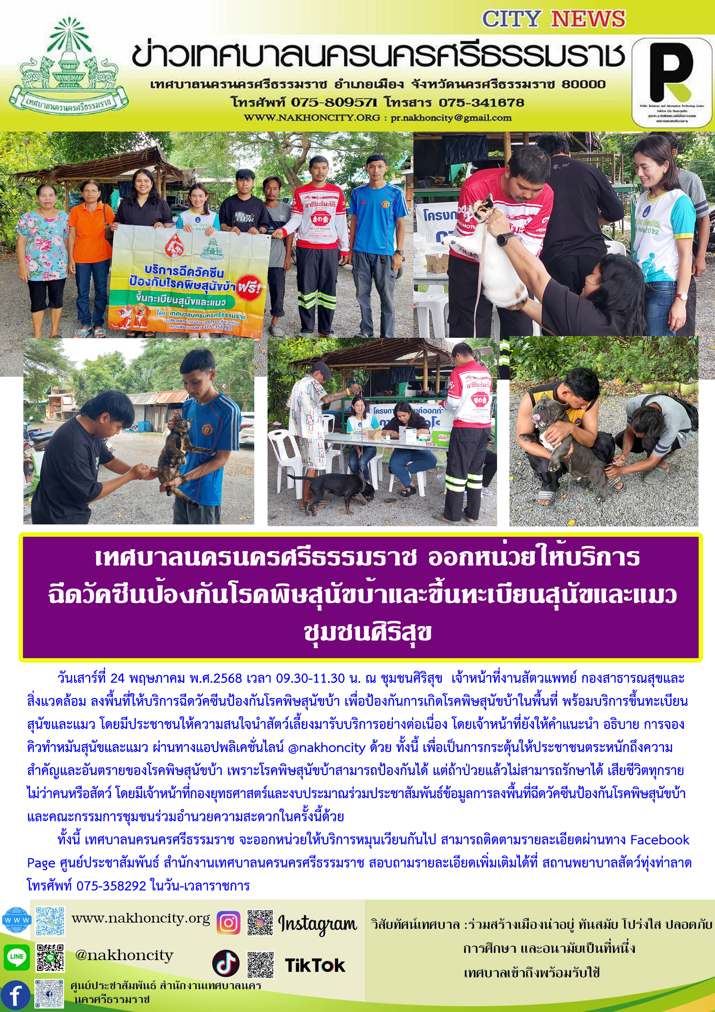 | เทศบาลนครนครศรีธรรมราช ออกหน่วยให้บริการ ฉีดวัคซีนป้องกันโรคพิษสุนัขบ้าและขึ้นทะเบียนสุนัขและแมว ชุมชนศิริสุข |
