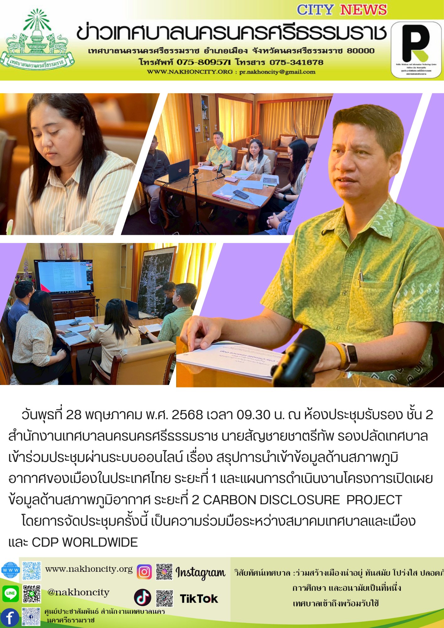 | วันพุธที่ 28 พฤษภาคม พ.ศ. 2568 เวลา 09.30 น. ณ ห้องประชุมรับรอง ชั้น 2 สำนักงานเทศบาลนครนครศรีธรรมราช นายสัญชาย ชาตรีทัพ รองปลัดเทศบาล เข้าร่วมประชุมผ่านระบบออนไลน์ เรื่อง สรุปการนำเข้าข้อมูลด้านสภาพภูมิอากาศของเมืองในประเทศไทย ระยะที่ 1 และแผนการดำเนินงานโครงการเปิดเผยข้อมูลด้านสภาพภูมิอากาศ ระยะที่ 2 Carbon Disclosure Project โดยการจัดประชุมครั้งนี้ เป็นความร่วมมือระหว่างสมาคมเทศบาลและเมือง และ CDP worldwide |