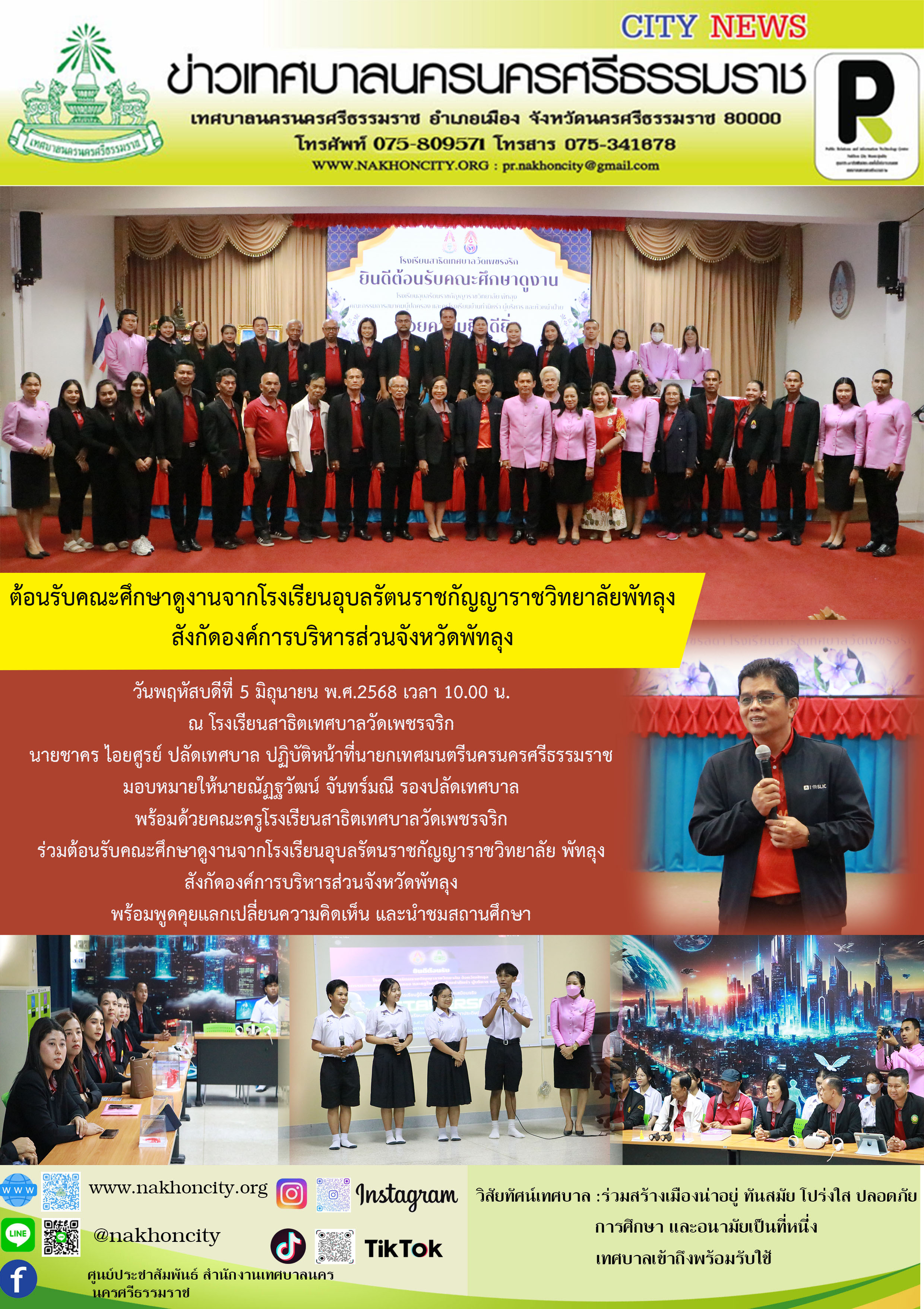 | วันพฤหัสบดีที่ 5 มิถุนายน พ.ศ.2568 เวลา 10.00 น. ณ โรงเรียนสาธิตเทศบาลวัดเพชรจริก นายชาคร ไอยศูรย์ ปลัดเทศบาล ปฏิบัติหน้าที่นายกเทศมนตรีนครนครศรีธรรมราช มอบหมายให้นายณัฏฐวัฒน์ จันทร์มณี รองปลัดเทศบาล พร้อมด้วยคณะครูโรงเรียนสาธิตเทศบาลวัดเพชรจริก ร่วมต้อนรับคณะศึกษาดูงานจากโรงเรียนอุบลรัตนราชกัญญาราชวิทยาลัย พัทลุง สังกัดองค์การบริหารส่วนจังหวัดพัทลุง พร้อมพูดคุยแลกเปลี่ยนความคิดเห็น และนำชมสถานศึกษา