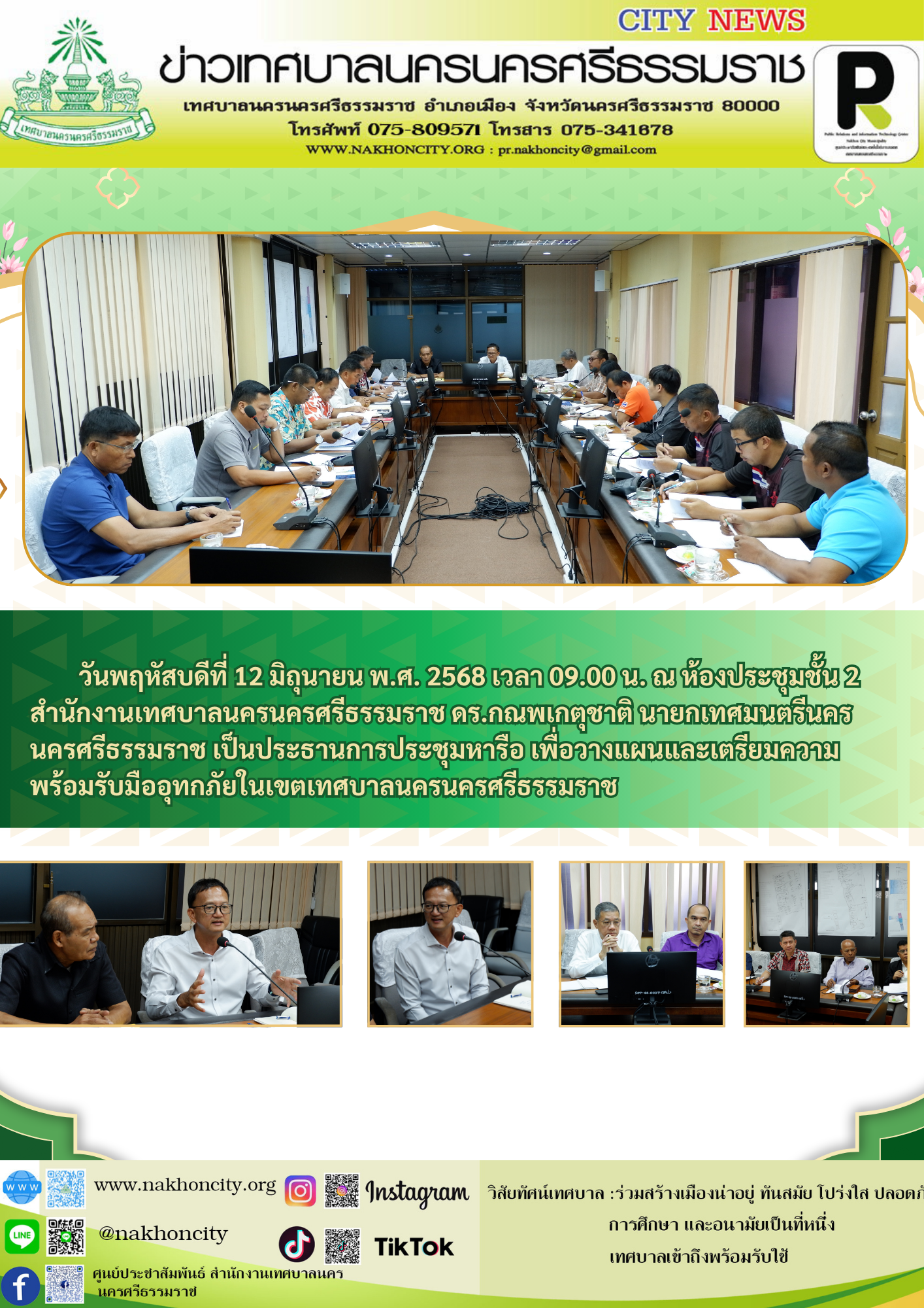 | วันพฤหัสบดีที่ 12 มิถุนายน พ.ศ. 2568 เวลา 09.00 น. ณ ห้องประชุมชั้น 2 สำนักงานเทศบาลนครนครศรีธรรมราช ดร.กณพ เกตุชาติ นายกเทศมนตรีนครนครศรีธรรมราช เป็นประธานการประชุมหารือ เพื่อวางแผนและเตรียมความพร้อมรับมืออุทกภัยในเขตเทศบาลนครนครศรีธรรมราช |