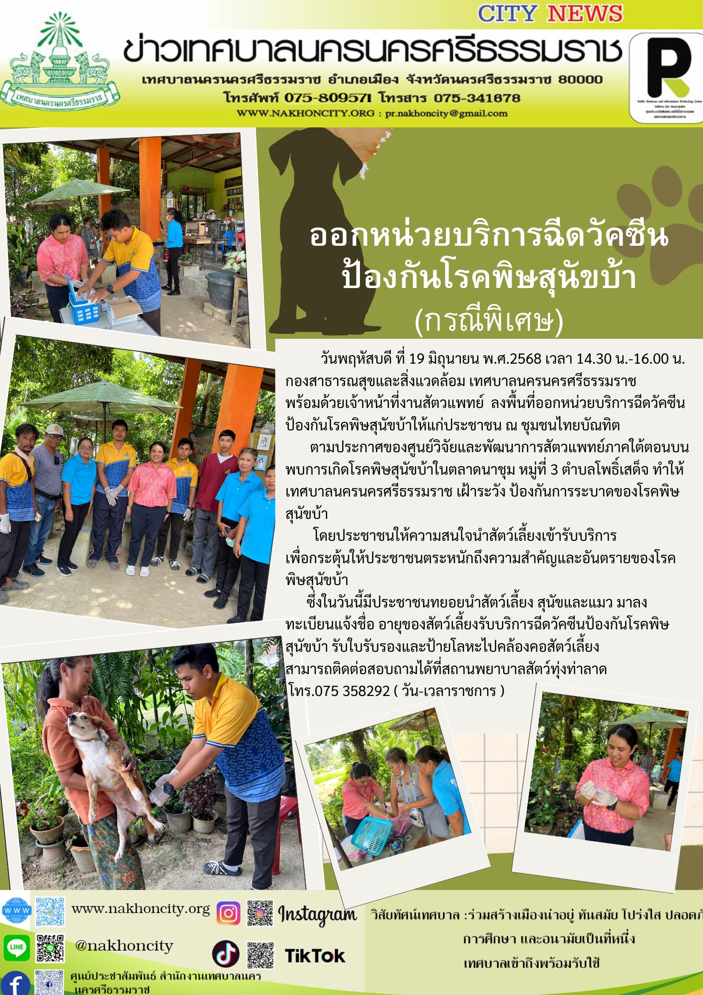 | วันพฤหัสบดี ที่ 19 มิถุนายน พ.ศ.2568 เวลา 14.30 น.-16.00 น. กองสาธารณสุขและสิ่งแวดล้อม เทศบาลนครนครศรีธรรมราช พร้อมด้วยเจ้าหน้าที่งานสัตวแพทย์ ลงพื้นที่ออกหน่วยบริการฉีดวัคซีนป้องกันโรคพิษสุนัขบ้าให้แก่ประชาชน ณ ชุมชนไทยบัณทิต ตามประกาศของศูนย์วิจัยและพัฒนาการสัตวแพทย์ภาคใต้ตอนบน พบการเกิดโรคพิษสุนัขบ้าในตลาดนาชุม หมู่ที่ 3 ตำบลโพธิ์เสด็จ ทำให้เทศบาลนครนครศรีธรรมราช เฝ้าระวัง ป้องกันการระบาดของโรคพิษสุนัขบ้าในพื้นที่ดังกล่าว ซึ่งในวันนี้มีประชาชนทยอยนำสัตว์เลี้ยง สุนัขและแมว มาลงทะเบียนแจ้งชื่อ อายุของสัตว์เลี้ยงรับบริการฉีดวัคซีนป้องกันโรคพิษสุนัขบ้า รับใบรับรองและป้ายโลหะไปคล้องคอสัตว์เลี้ยง สามารถติดต่อสอบถามได้ที่สถานพยาบาลสัตว์ทุ่งท่าลาด โทร.075 358292 ( วัน-เวลาราชการ ) |